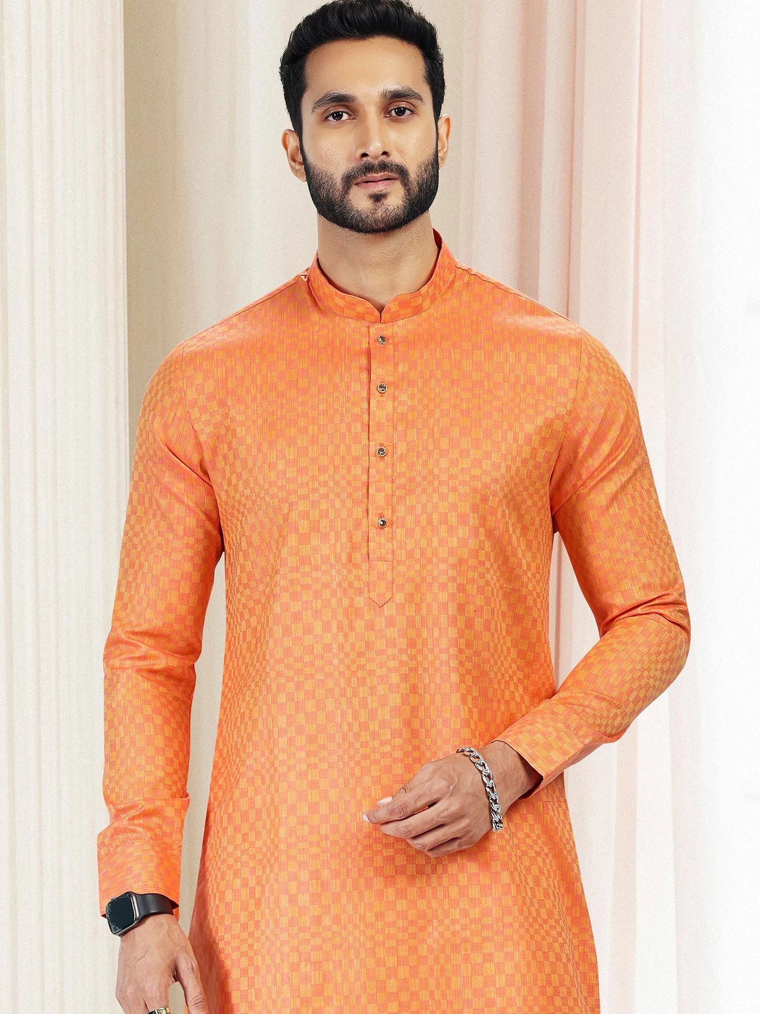 Displaying this orange color kurta made in silk. Furnished with printed patterns with mandarin collar, buttoned placket and full sleeves. Paired with a white color trouser pants in art silk. Note: Some color variations may occur owing to photography causes. Up to 1 inch of measurement fluctuation is possible.