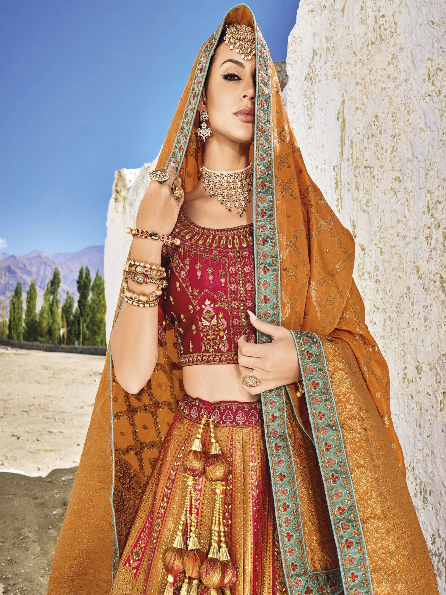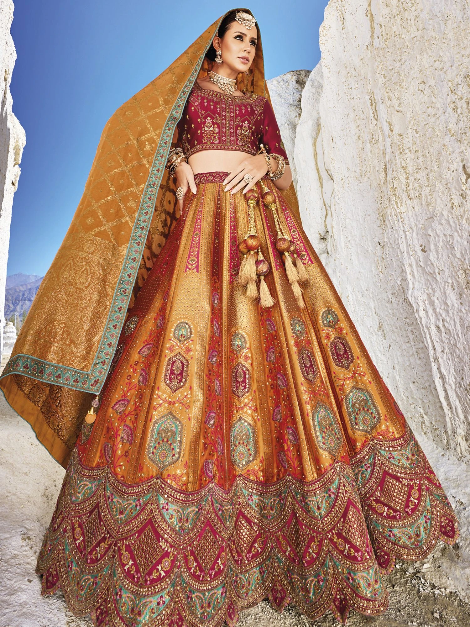 Makes it a versatile choice of every celebration wearing this burnt orange color designer lehenga made in banarsi silk, jacquard. Elevated with sequins, stone and zari with thread embroidered and printed work. Comes with a matching maroon color embroidered choli in satin and orange color designer dupatta, made in viscose georgette. Note: The accessories featured are purely for fashion purposes. Due to photography reasons, some color variations may occur. The semi-stitched choli and lehenga waist may be customized up to 42 inches.