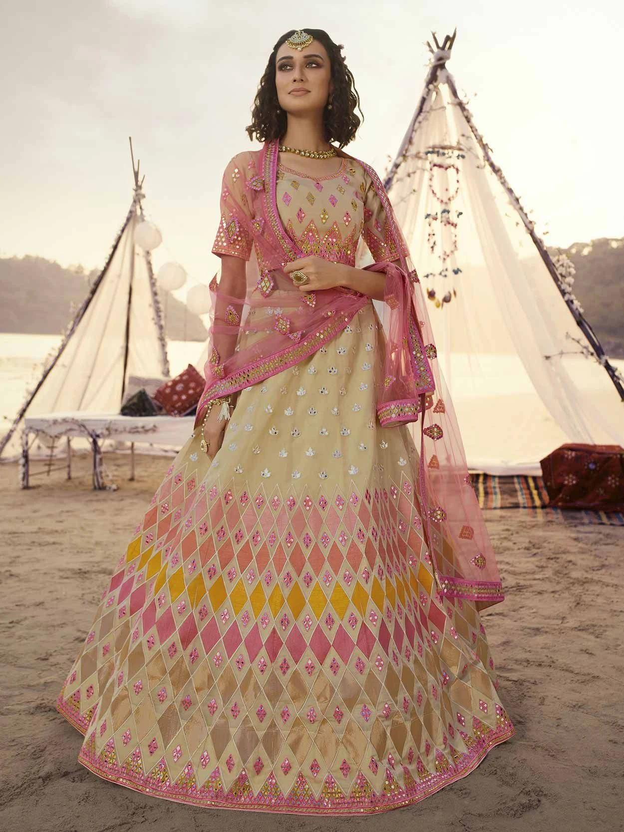 Beige Colour Organza Fabric Appealing Lehenga Choli In Traditional Look This attire is nicely made with Thread,Mirror Work work.