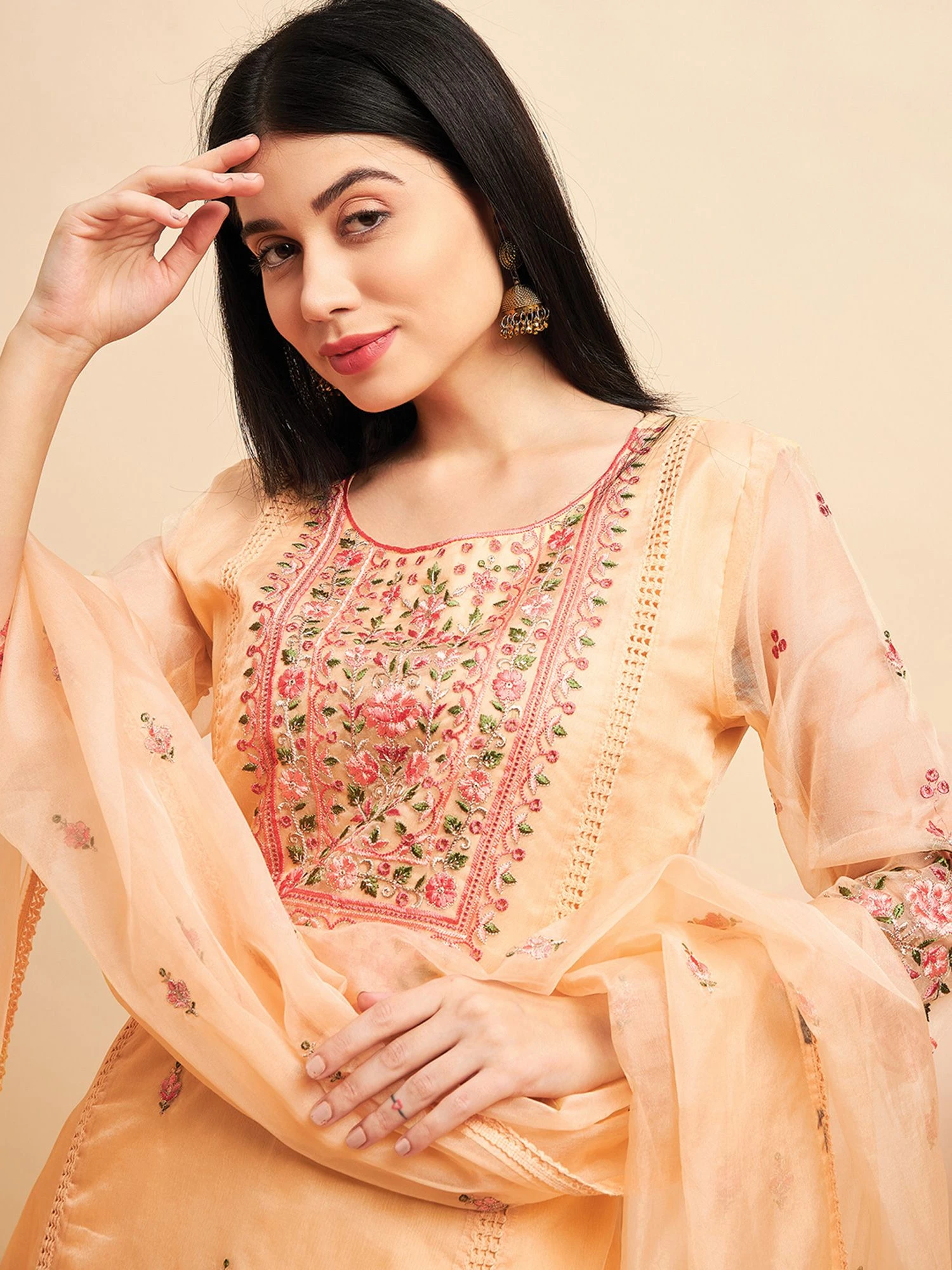 Glam up the views with this coral peach color straight cut kameez in organza. Enhanced using floral thread embroidered. Assigned with a organza dupatta and a pant style bottom, both made in peach color. Note: Accessories shown are for styling purpose only. Slight color variation may occur due to photographic reasons. The semi-stitched kameez can be customised upto 42 inches.