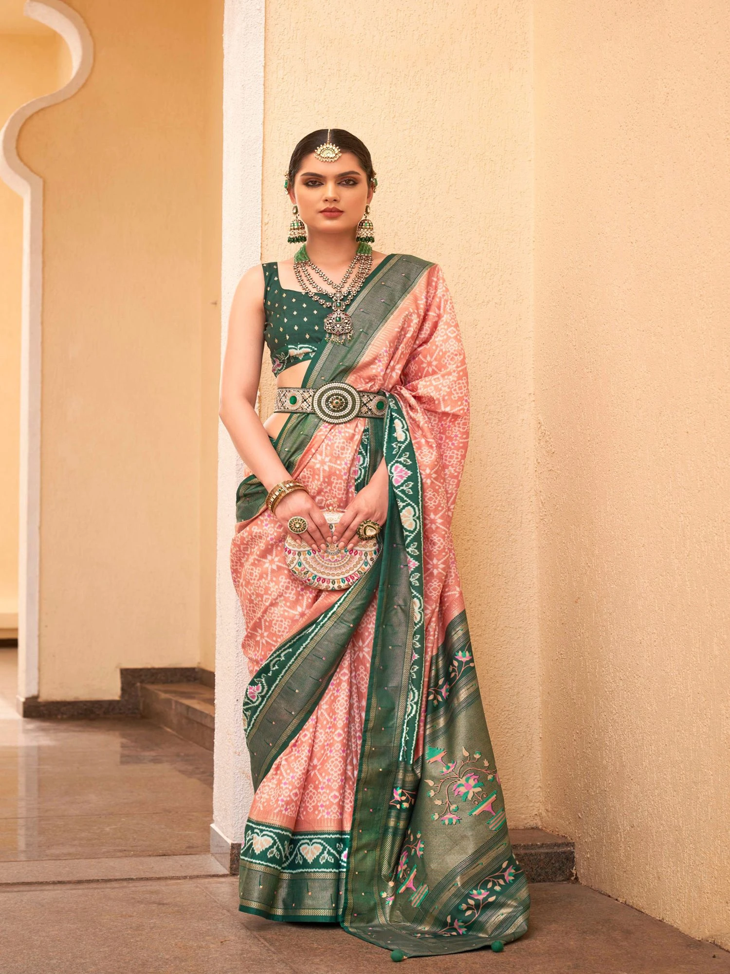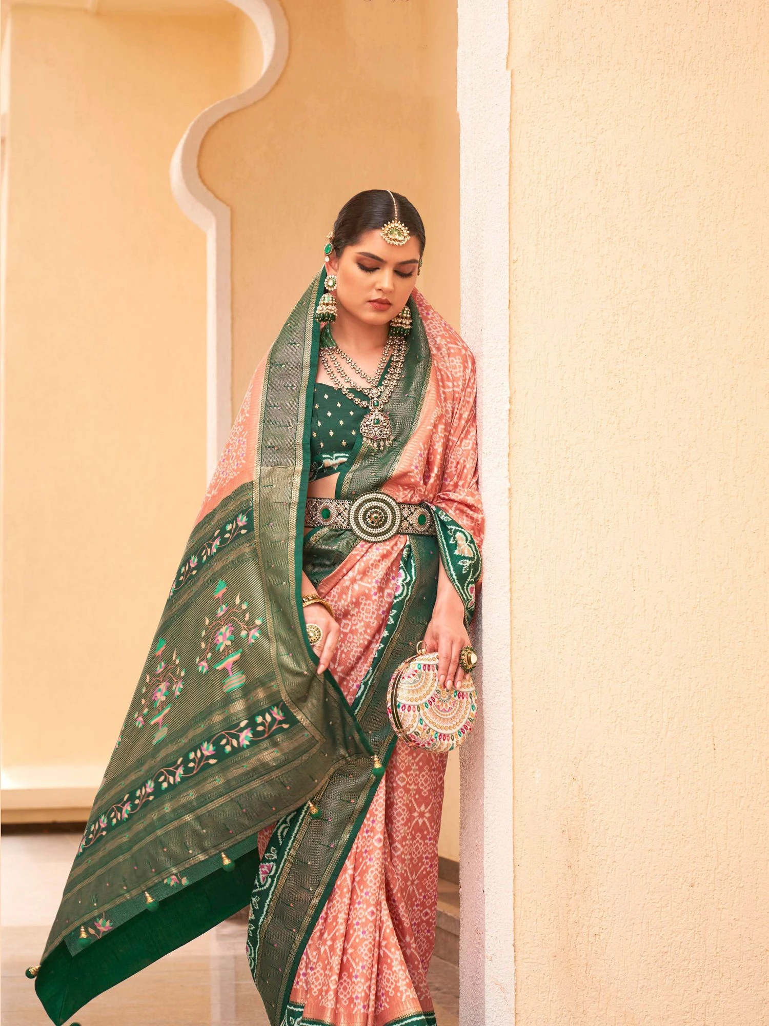 Making it a wardrobe essential for every occasion wearing this creamy peach color saree crafted in silk. Enhanced using printed patterns, showcasing distinstive borders and pallu. Comes with a matching dark green color blouse in silk. Note: The accessories featured are purely for fashion purposes. Due to photography reasons, some color variations may occur. The un-stitched blouse may be customized up to 42 inches.