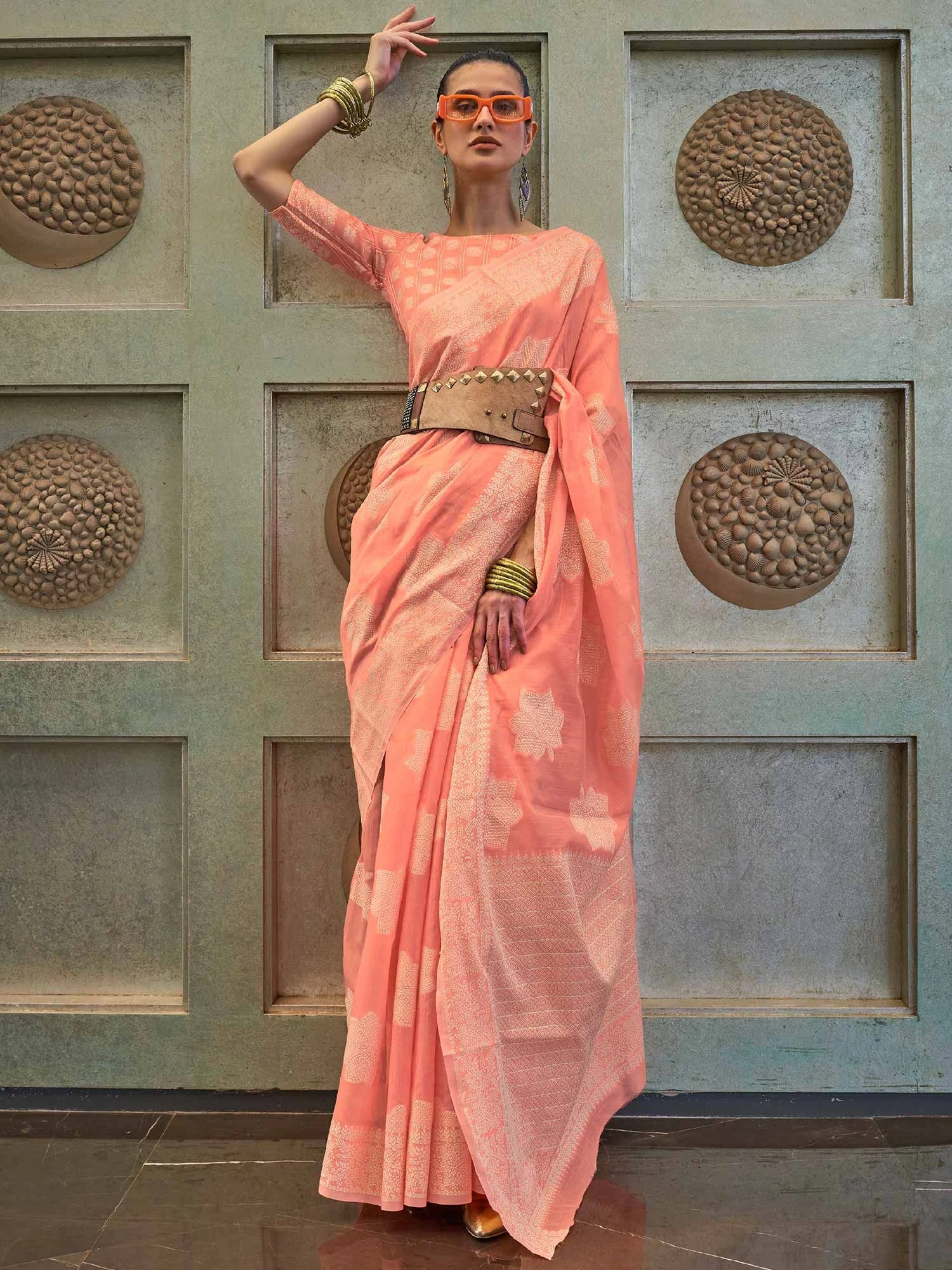 Make a stately statement sporting this bright peach color saree crafted in silk. Furnished using chikankari patterns all over. Paired with a matching peach color blouse in silk. Note: The accessories featured are purely for fashion purposes. Due to photography reasons, some color variations may occur. The un-stitched blouse may be customized up to 42 inches.