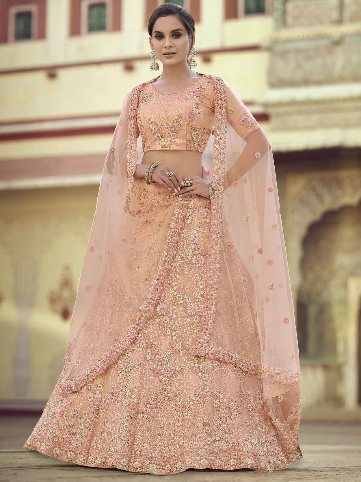 Women’s Peach Colour Net Fabric Circular Lehenga Style This attire is nicely made with Zari,Thread,Sequin work.