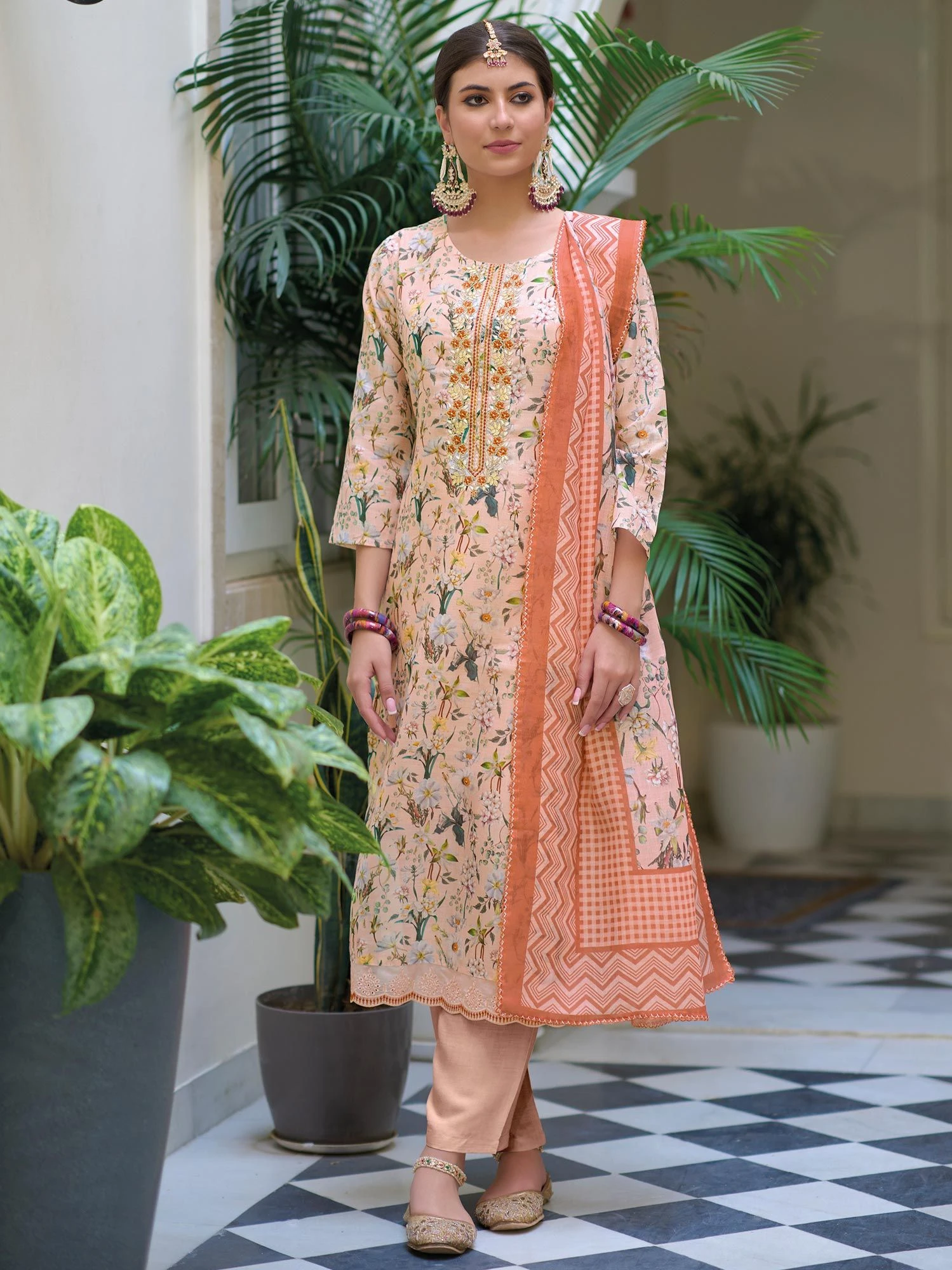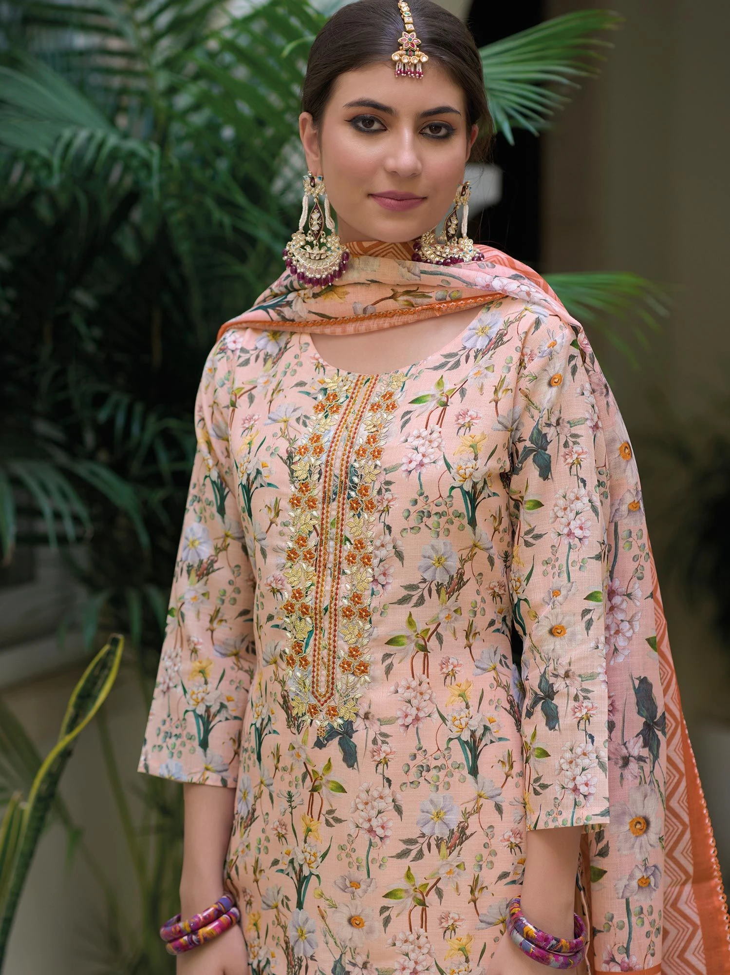 Give life to your ethnic look adorning this sweet peach color straight cut kameez in linen. Crafted using floral prints, sequins and thread work embroidery along the edges. Paired with a peach floral dupatta in linen and a matching pant in cotton. Note: Accessories shown are for styling purpose only. Slight color variation may occur due to photographic reasons. The semi-stitched kameez can be customised upto 42 inches.