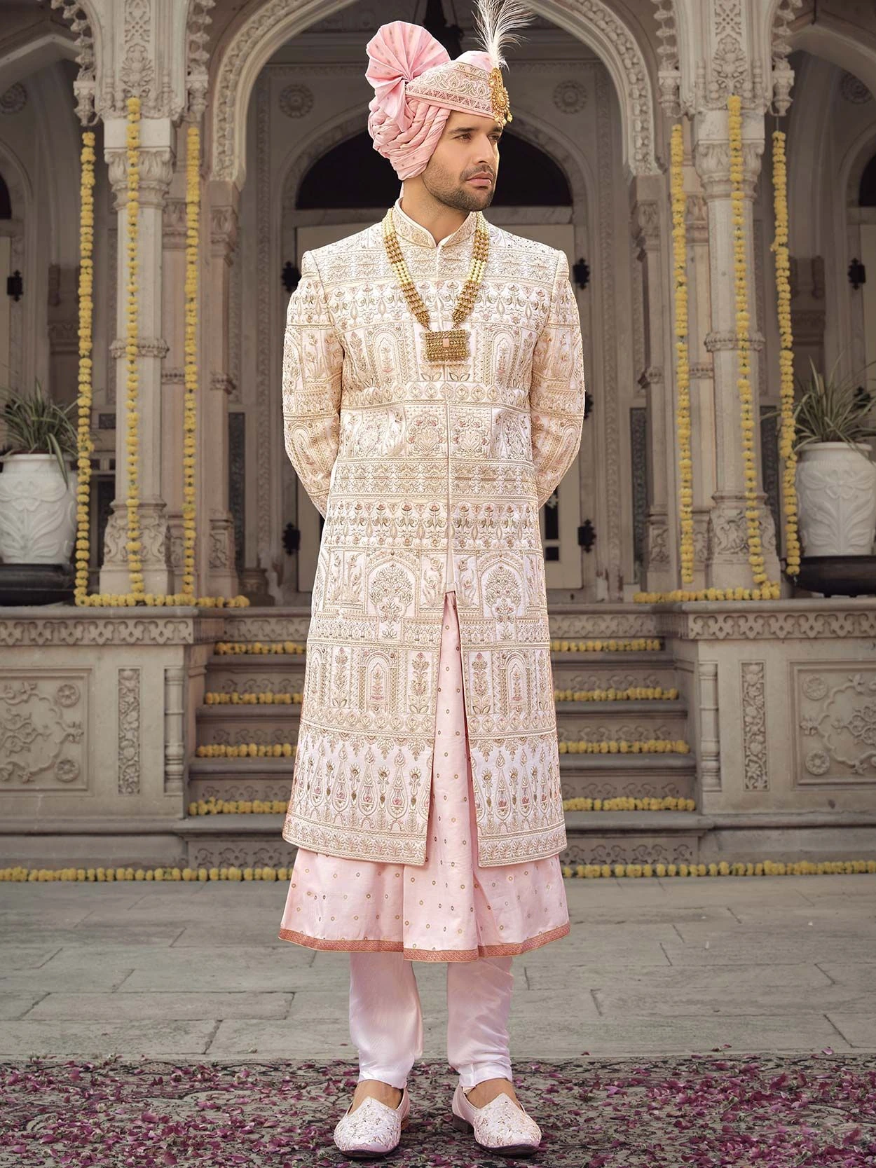 Up your style game as you wear this light peach color readymade layered sherwani with matching anarkali kurta underneath made in art silk. Decorated using traditional themed thread embroidery with stones, sequins embellishment work. Crafted using mandarin collar, front opening and full sleeves. Paired with white color churidaar in art silk. Please note that some color variations may occur owing to photography causes. Up to 1 inch of measurement fluctuation is possible.