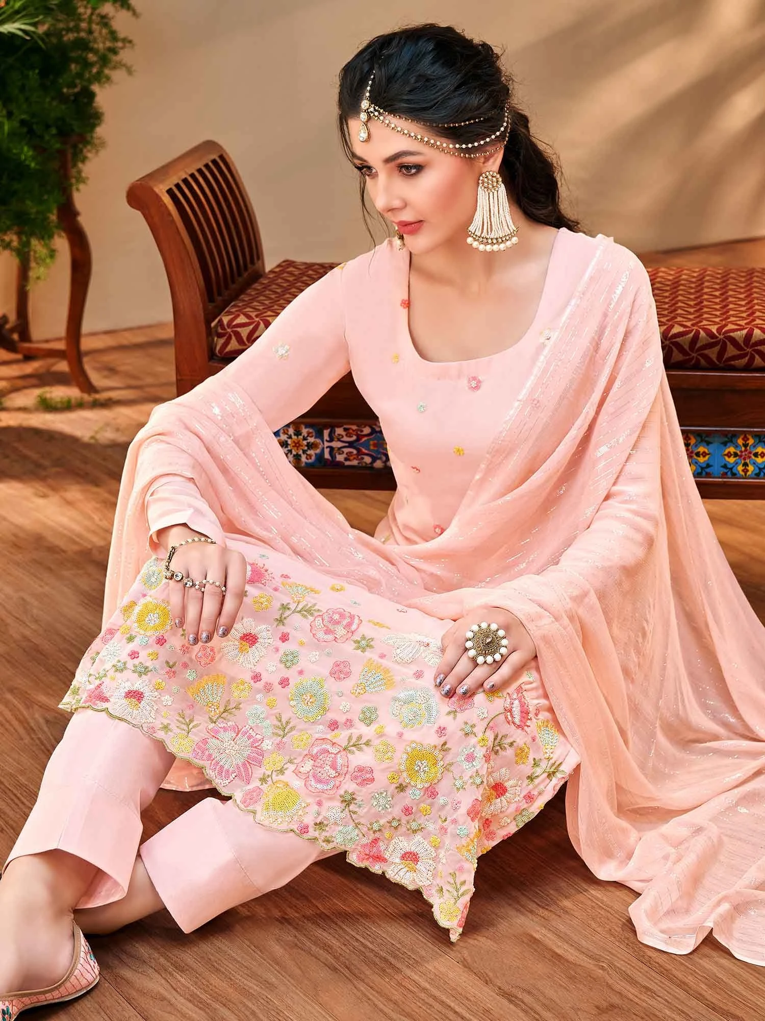 Displaying this soft peach color straight cut kameez in georgette. Enhanced using sequins and thread embroidery all over. Teamed with a matching chiffon dupatta and a matching bottom in shantoon. Note: Accessories shown are for styling purpose only. Slight color variation may occur due to photographic reasons. The semi-stitched kameez can be customised upto 42 inches.