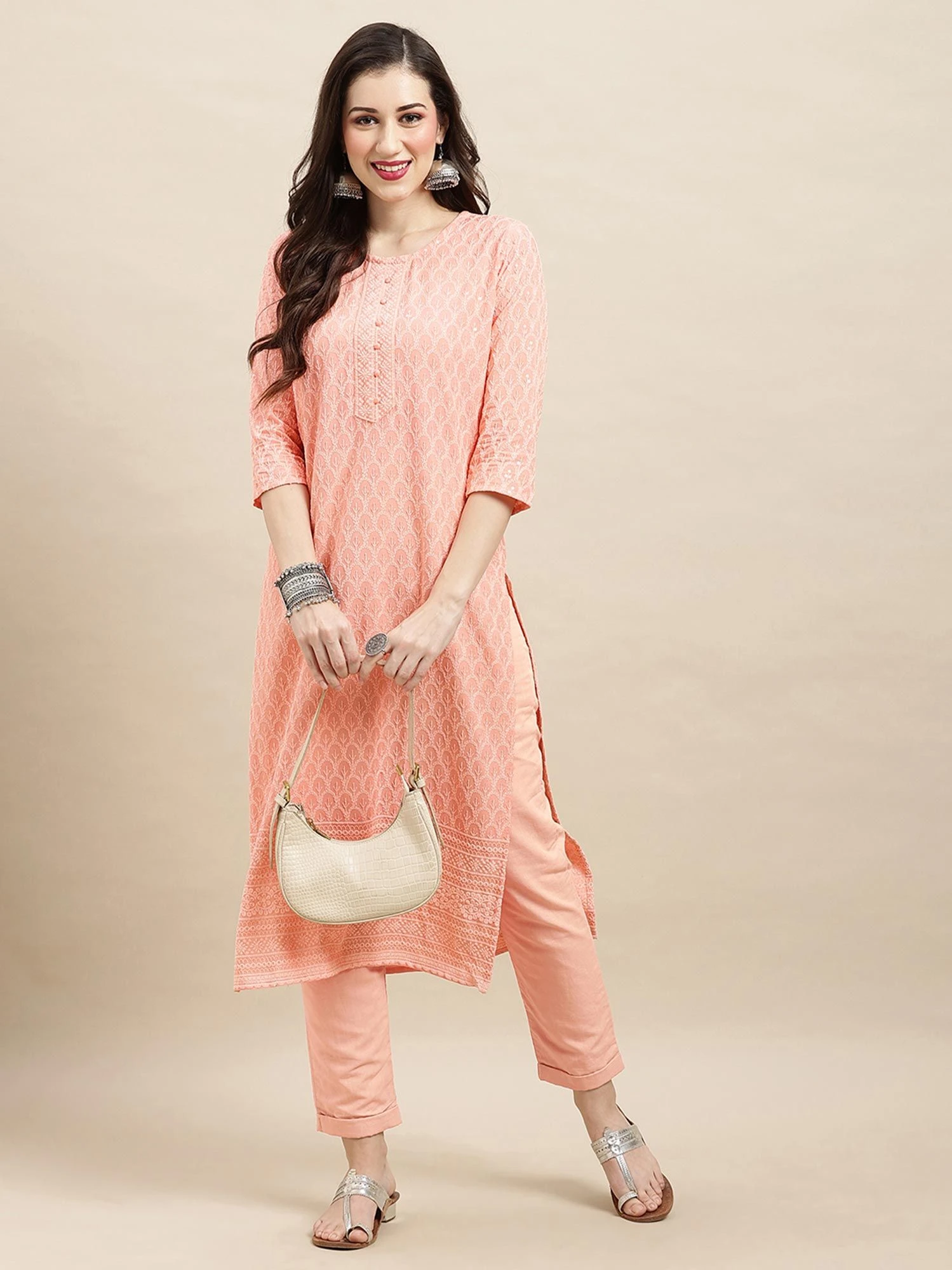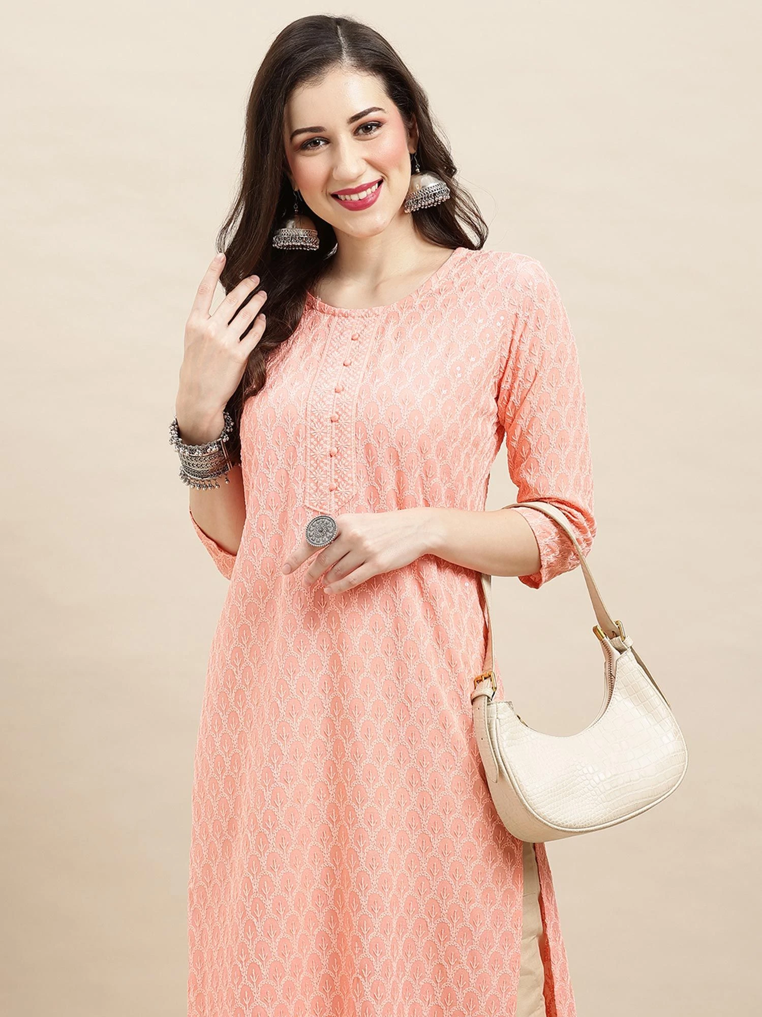 Steal the spotlight adorning this soft peach color quarter sleeved kurti made in rayon. Elevated with sequins and resham embroidered details all over. Note: Some color variations may occur owing to photography causes. Up to 1 inch of measurement fluctuation is possible.