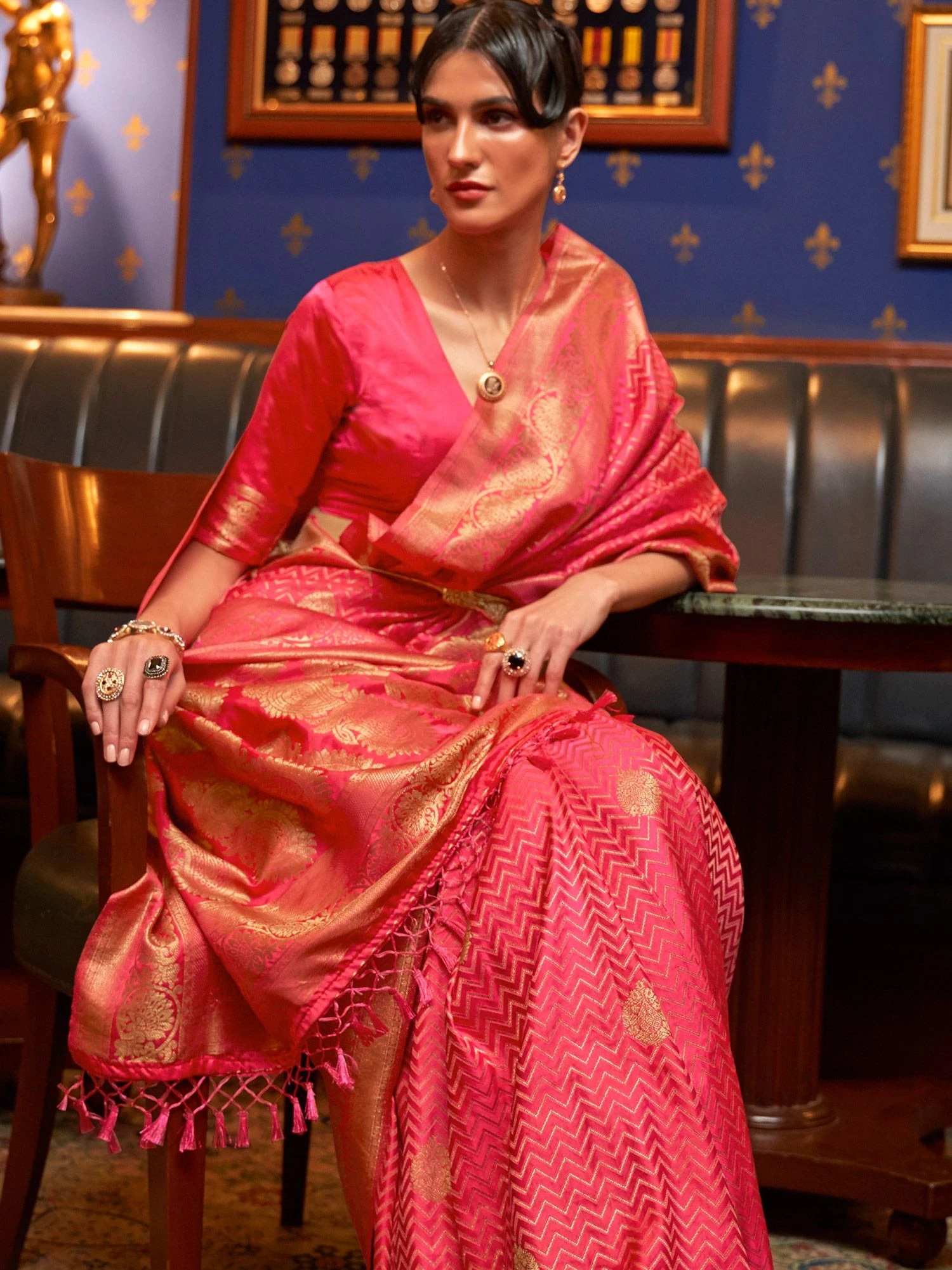 Wrap yourself in culture wearing this sweet peach color saree fabricated in art silk. Decorated using zari woven patterns, showcasing distinstive borders and pallu. Comes with a matching color blouse in art silk. Note: The accessories featured are purely for fashion purposes. Due to photography reasons, some color variations may occur. The un-stitched blouse may be customized up to 42 inches.