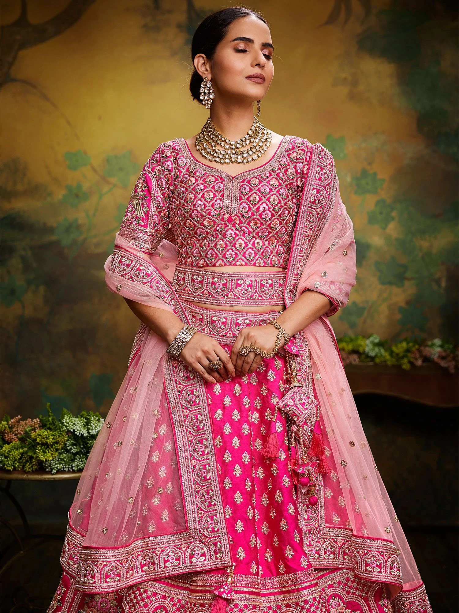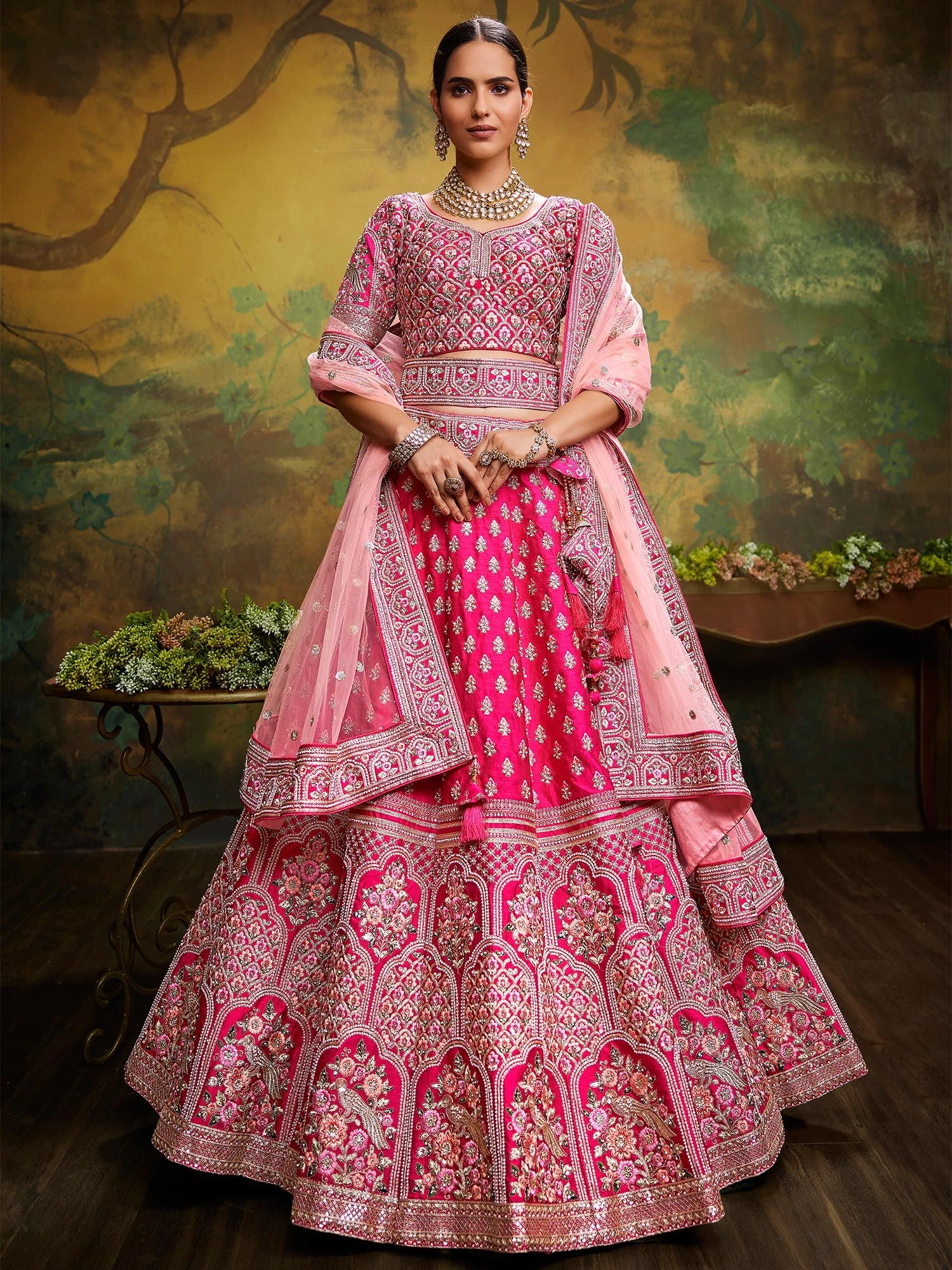 Transform into a vision of beauty wearing this hot pink color lehenga in silk. Decorated with stones, sequins, zari and thread embroidered work all over. Paired with a matching pink color embroidered silk choli and a pink net dupatta with dense borders. Note: The accessories featured are purely for fashion purposes. Due to photography reasons, some color variations may occur. The semi-stitched choli and lehenga waist may be customized up to 42 inches.