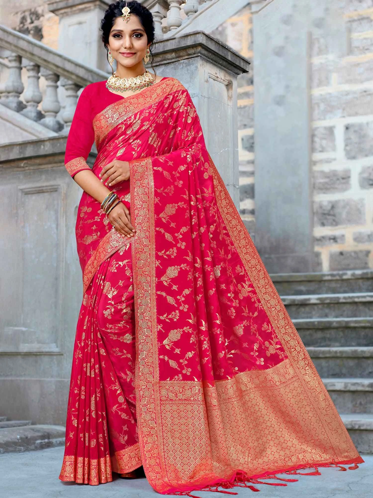 Glam up sweetly with this bright pink color saree crafted in art silk. Enhanced using zari woven patterns, showcasing distinctive borders and pallu. Paired with a matching pink color blouse in dupion silk. Note: The accessories featured are purely for fashion purposes. Due to photography reasons, some color variations may occur. The un-stitched blouse may be customized up to 42 inches.