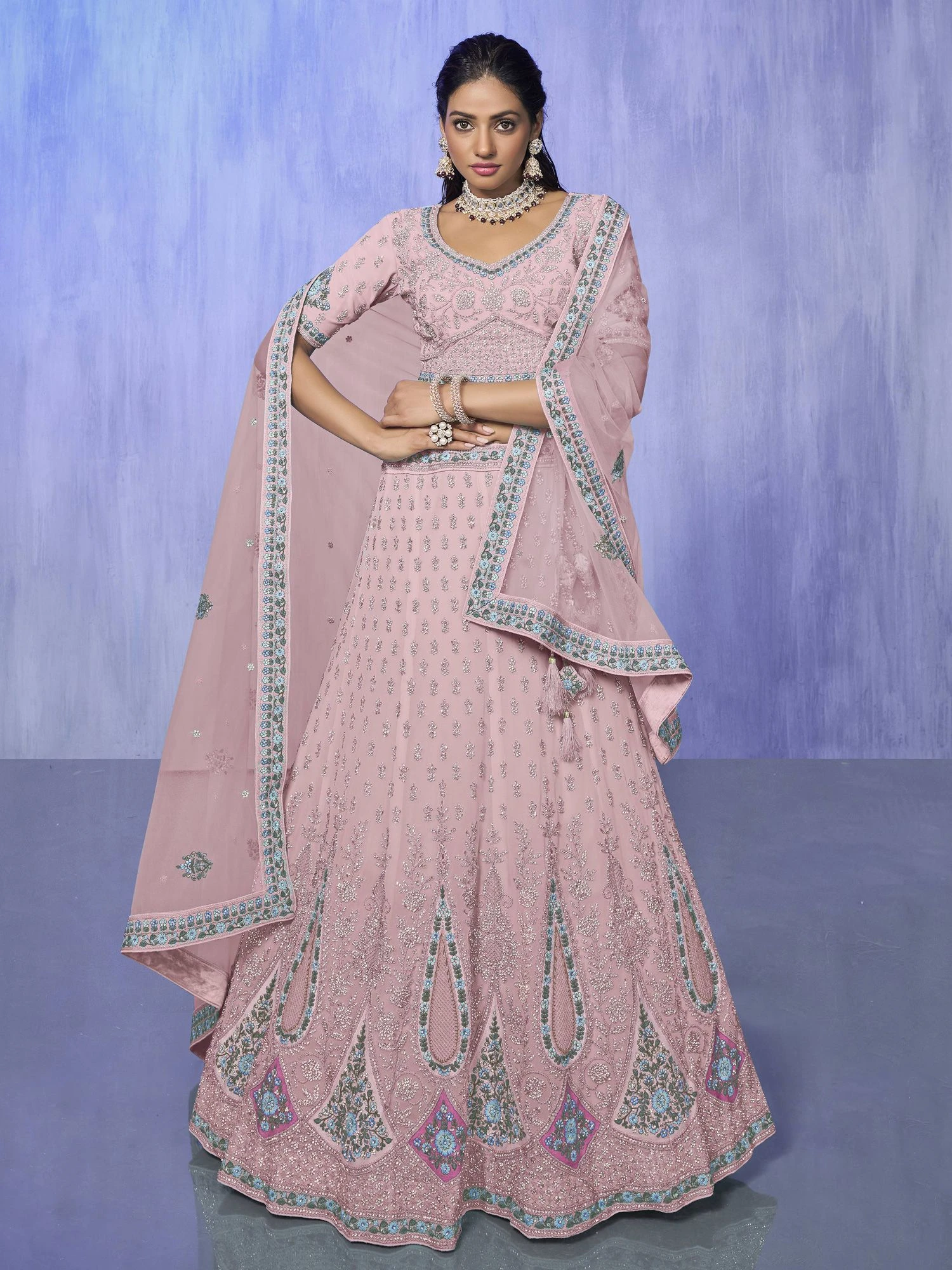 Establish a symbol of style with femininity wearing this dusty pink color designer lehenga in georgette. Decorated with sequins, stone work with heavy embroidery. Paired with a matching pink color embroidered choli in georgette and pink color dupatta, made in net. Note: The accessories featured are purely for fashion purposes. Due to photography reasons, some color variations may occur. The semi-stitched choli and lehenga waist may be customized up to 42 inches.