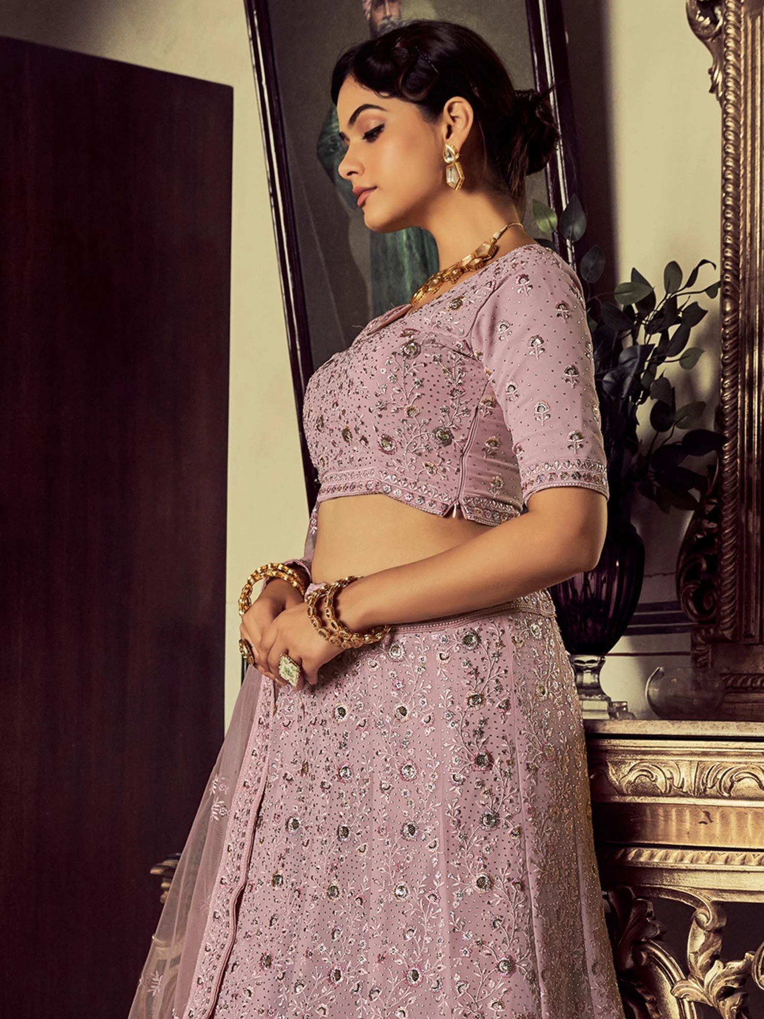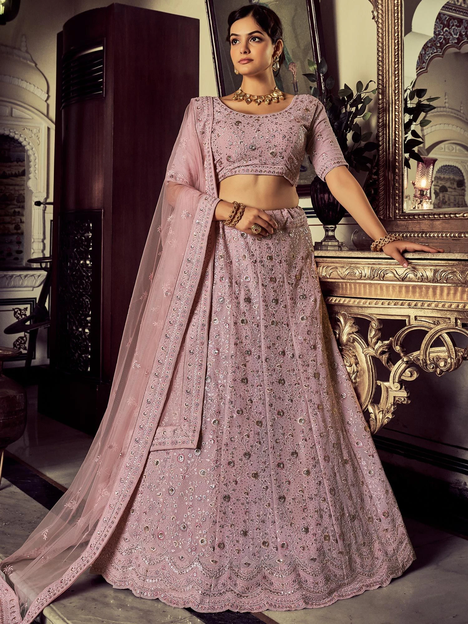 Step into the spotlight wearing this dusty pink color lehenga in georgette. Decorated with stones, sequins and thread embroidered work. Available with a matching pink color embroidered georgette choli and a pink dupatta made in net. Note: The accessories featured are purely for fashion purposes. Due to photography reasons, some color variations may occur. The semi-stitched choli and lehenga waist may be customized up to 42 inches.