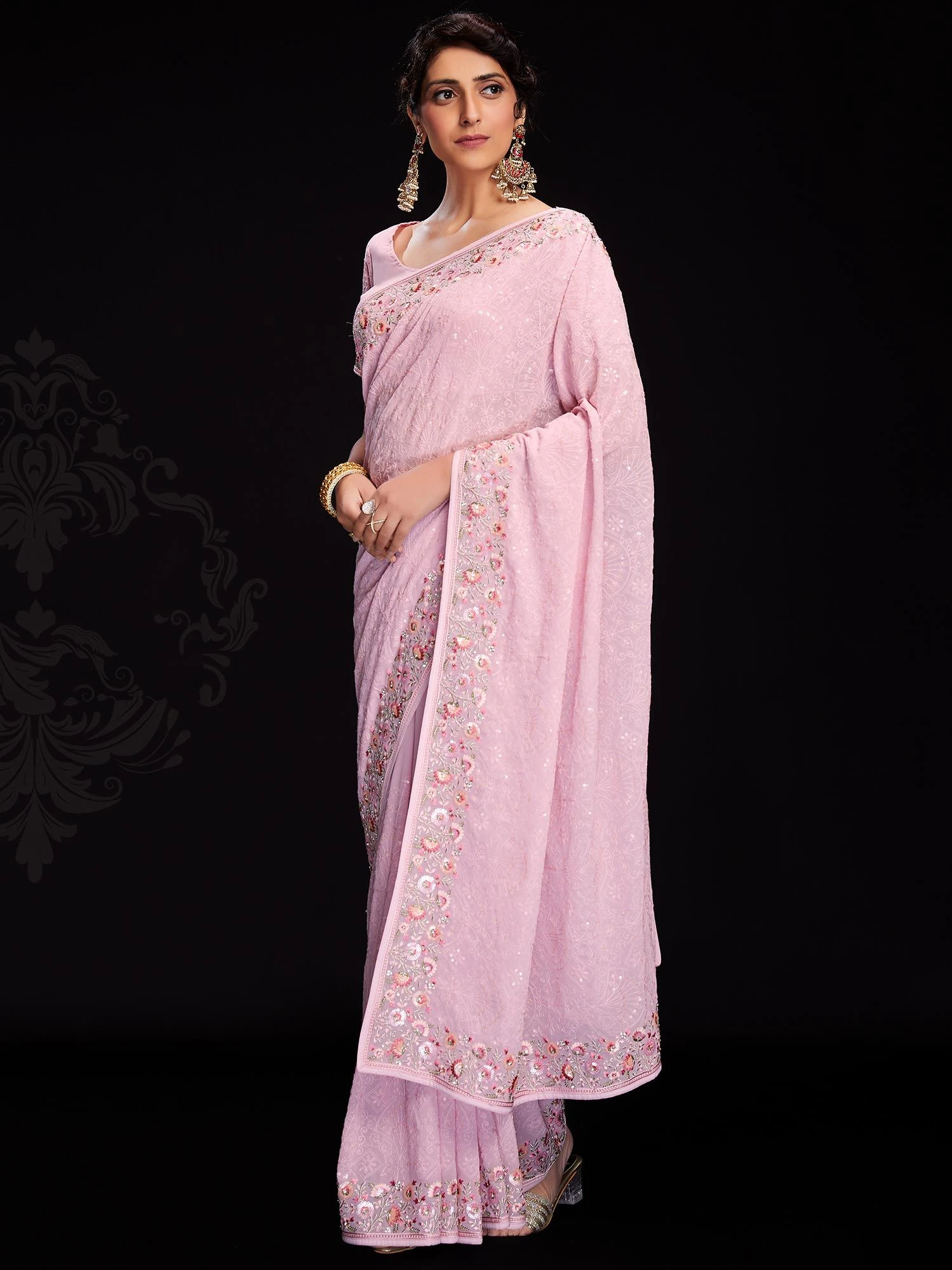 Embrace your distinct culture adorning this pink color saree in georgette. Augmented using sequins, chikankari embroidered patterns all over. Paired with a matching pink color blouse in georgette. Note: The accessories featured are purely for fashion purposes. Due to photography reasons, some color variations may occur. The un-stitched blouse may be customized up to 42 inches.
