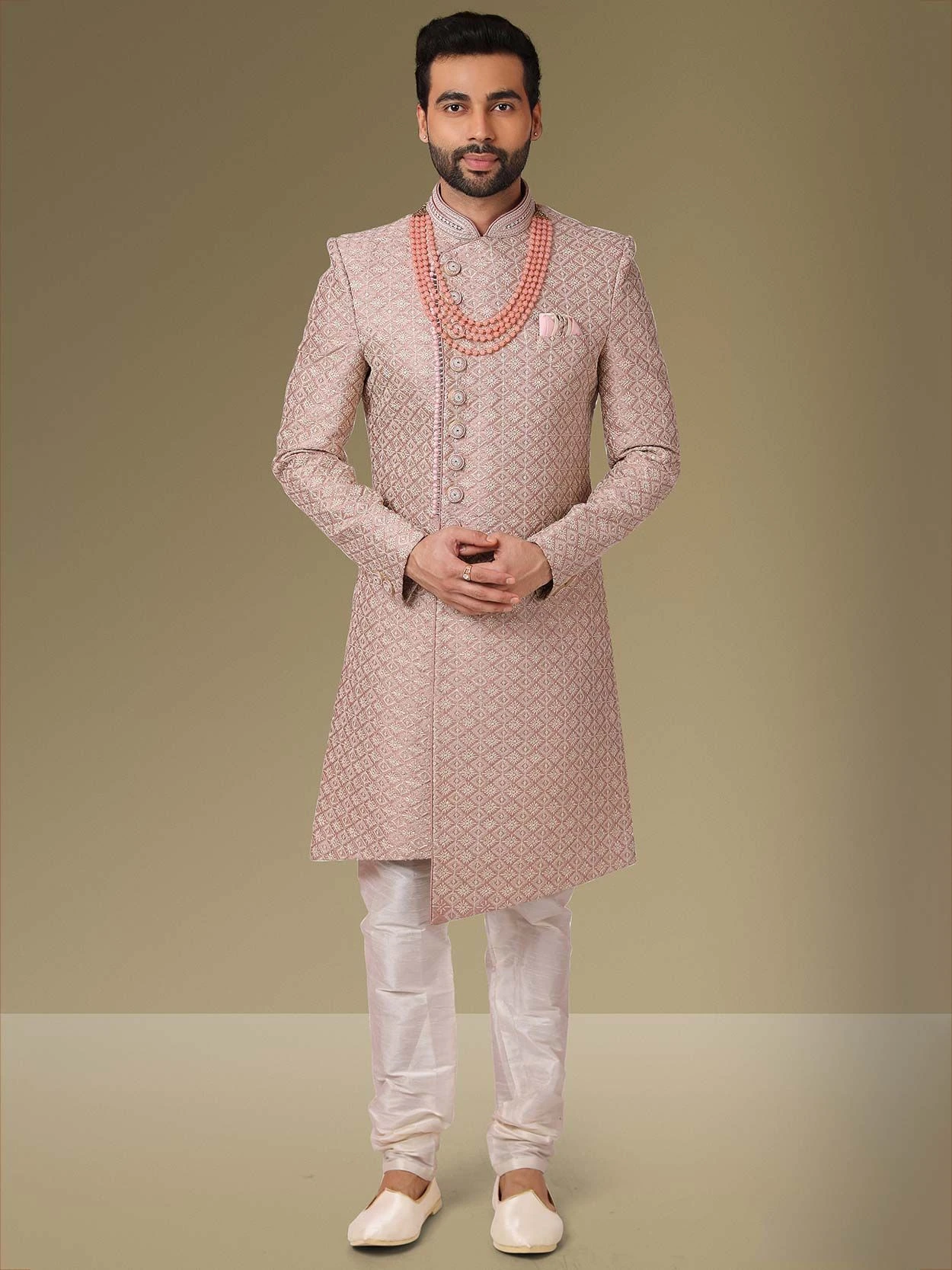 An charmingly styled Pink Colour Art Banarasi Silk Fabric Men’s Sherwani that is ideally suited for all ethnic moments. All patterns are intricately embellished Embroidered work.