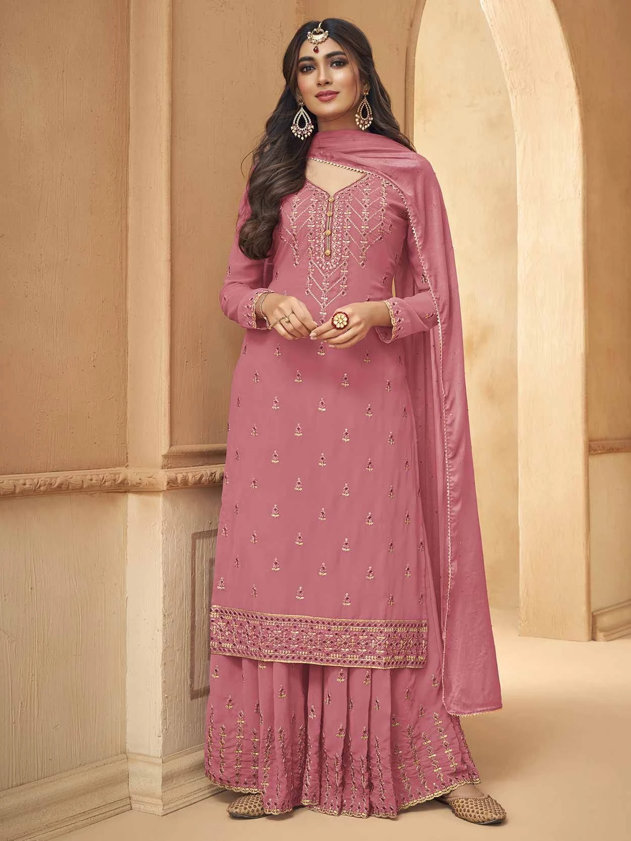 Be your unique style diva with this Pink Colour Faux Georgette Fabric Semi Stitched Salwar Kameez. The lovely Zari,Embroidery,Sequins work a substantial attribute of this attire.