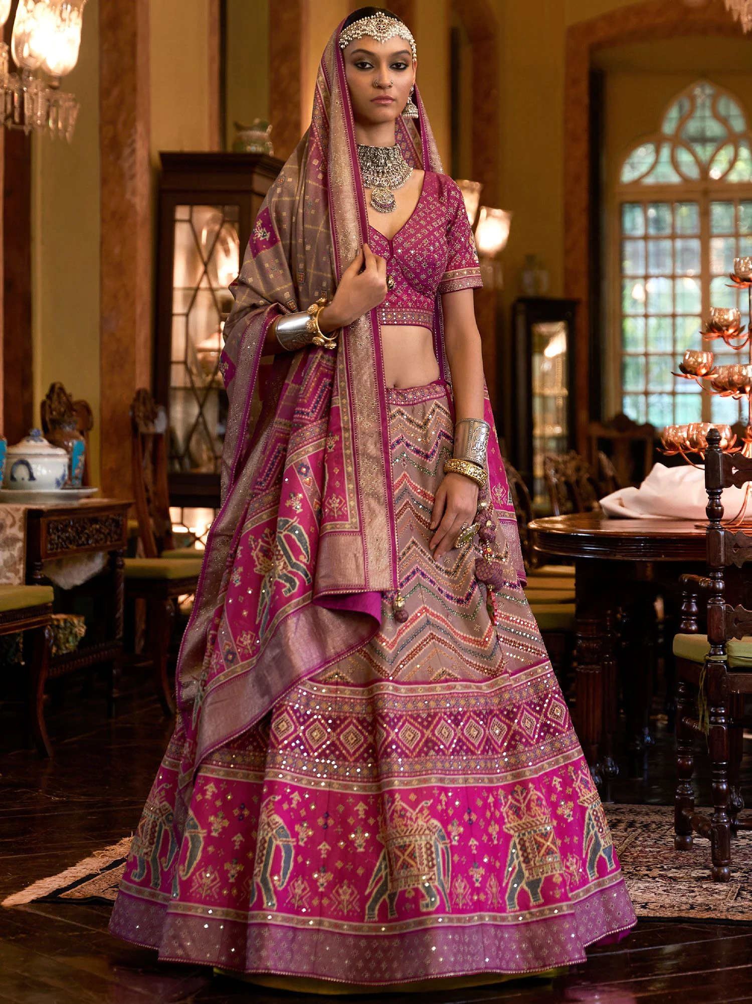 Charm all hearts wearing this dark pink color bridal lehenga in silk. Decked with mirror work, stones and traditional woven detailings all over. Comes with a pink color embellished choli and a pink shaded silk dupatta enhanced with matching work. Note: The accessories featured are purely for fashion purposes. Due to photography reasons, some color variations may occur. The semi-stitched choli and lehenga waist may be customized up to 42 inches.