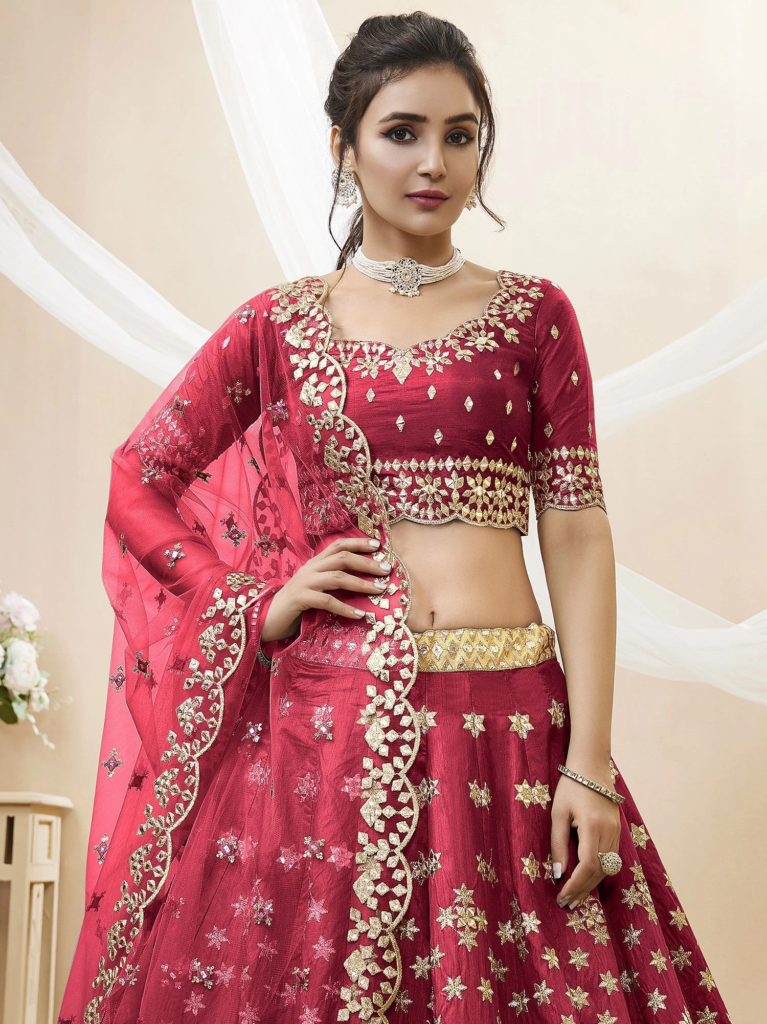 Embrace the warmth of festivities wearing this deep pink color lehenga in art silk. Enhanced with gota patti, zari embroidered work. Assembled with a matching pink color embroidered art silk choli and a pink net dupatta with scalloped borders. Note: The accessories featured are purely for fashion purposes. Due to photography reasons, some color variations may occur. The semi-stitched choli and lehenga waist may be customized up to 42 inches.