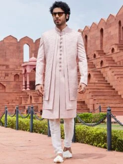 Spreading the sparking vibes with adorning this crepe pink color jacketed indowestern sherwani made in silk. Augmented using thread embroidery work. Paired with off-white color churidaar in silk. Note: Some color variations may occur owing to photography causes. Up to 1 inch of measurement fluctuation is possible.