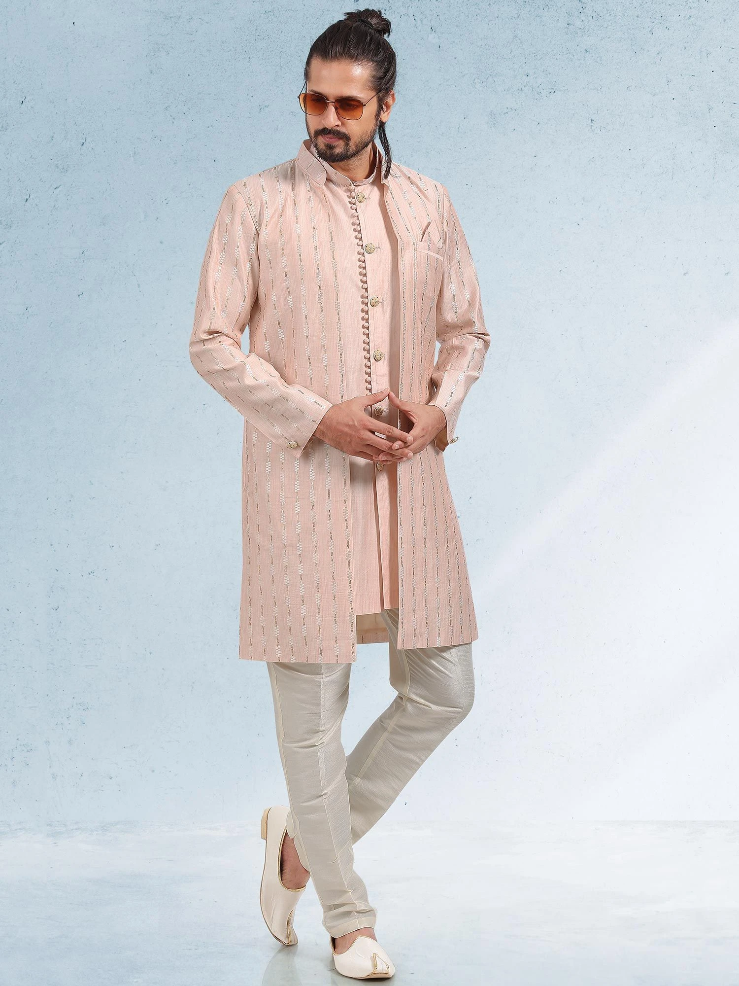 Shine all day adorning this light pink color men’s kurta made in art silk. Assembled with a jacket enriched with thread embroidery with sequins embellishment work. Paired with a matching white color churidaar in art silk. Note: Some color variations may occur owing to photography causes. Up to 1 inch of measurement fluctuation is possible.