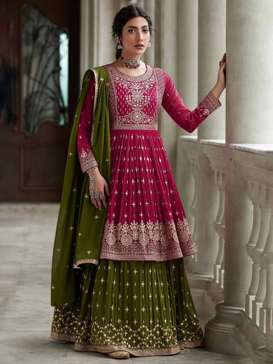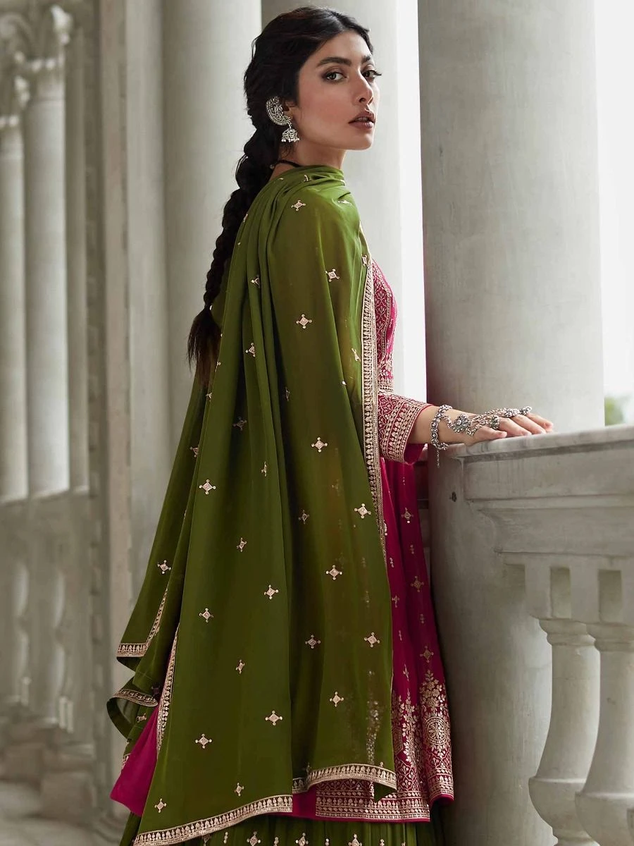 Up your style game wearing this pink hued kurti in georgette. Decorated with sequins and thread embroidered work. Teamed with contrast matching green color georgette lehenga and dupatta, both embellished in similar work. Note: The accessories featured are purely for fashion purposes. Due to photography reasons, some color variations may occur. The semi-stitched choli and lehenga waist may be customized up to 42 inches.