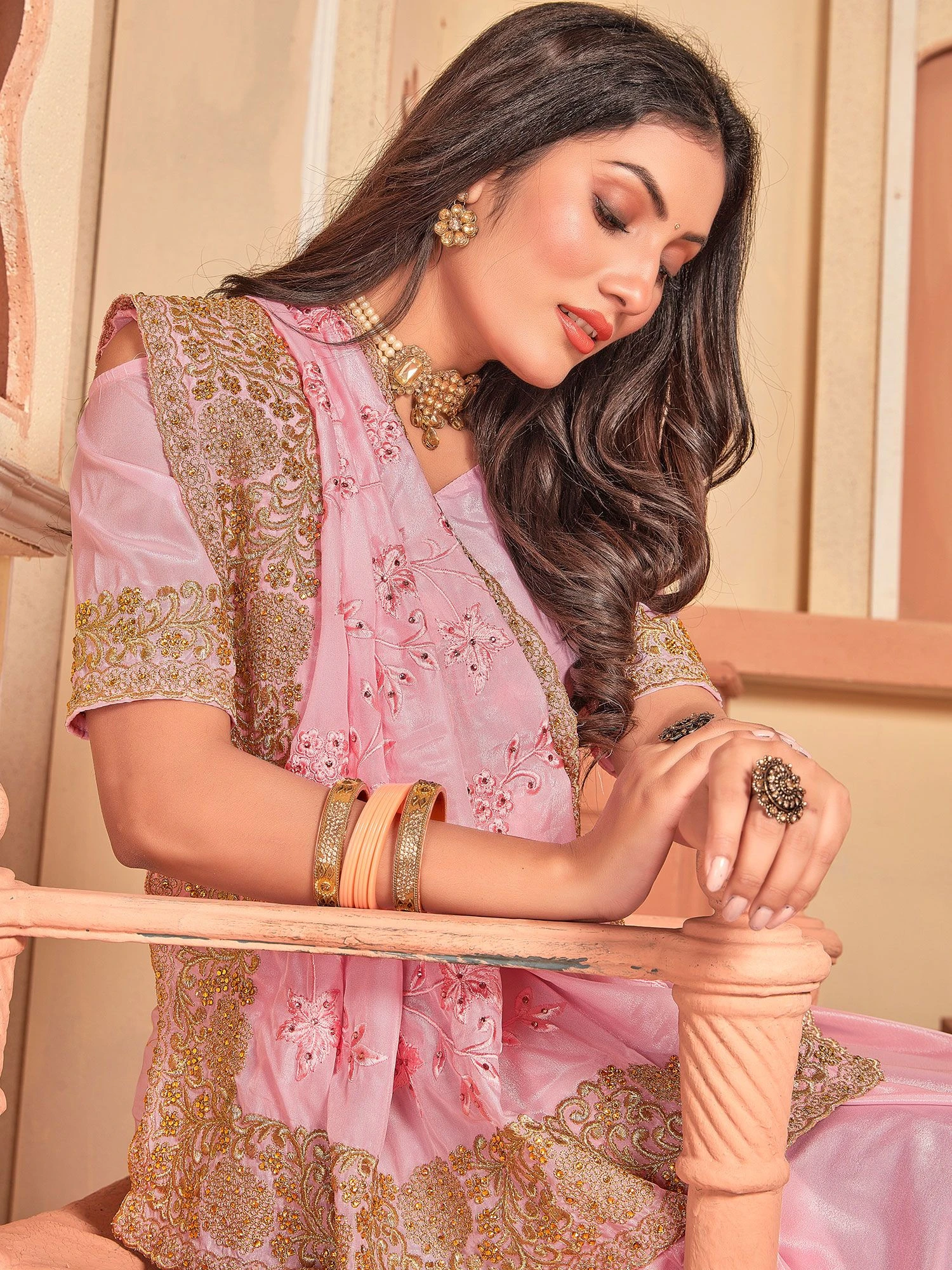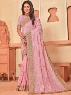 Own your effortless style as you wear this blush pink color saree crafted in crepe. Elevated using thread embroidery and stone embellishments, showcasing distinstive borders and pallu. Available with a matching pink color blouse in crepe. Note: The accessories featured are purely for fashion purposes. Due to photography reasons, some color variations may occur. The un-stitched blouse may be customized up to 42 inches.