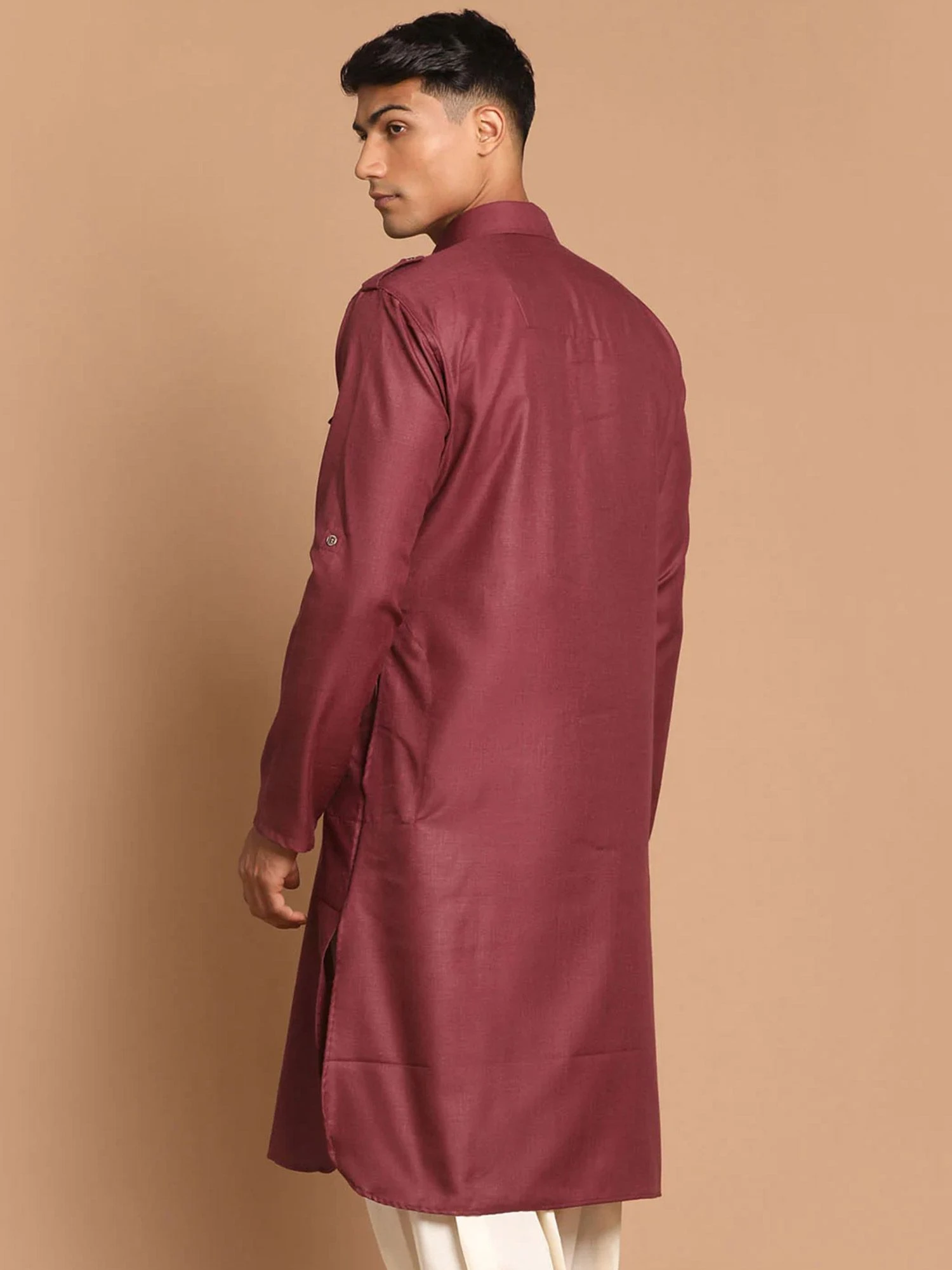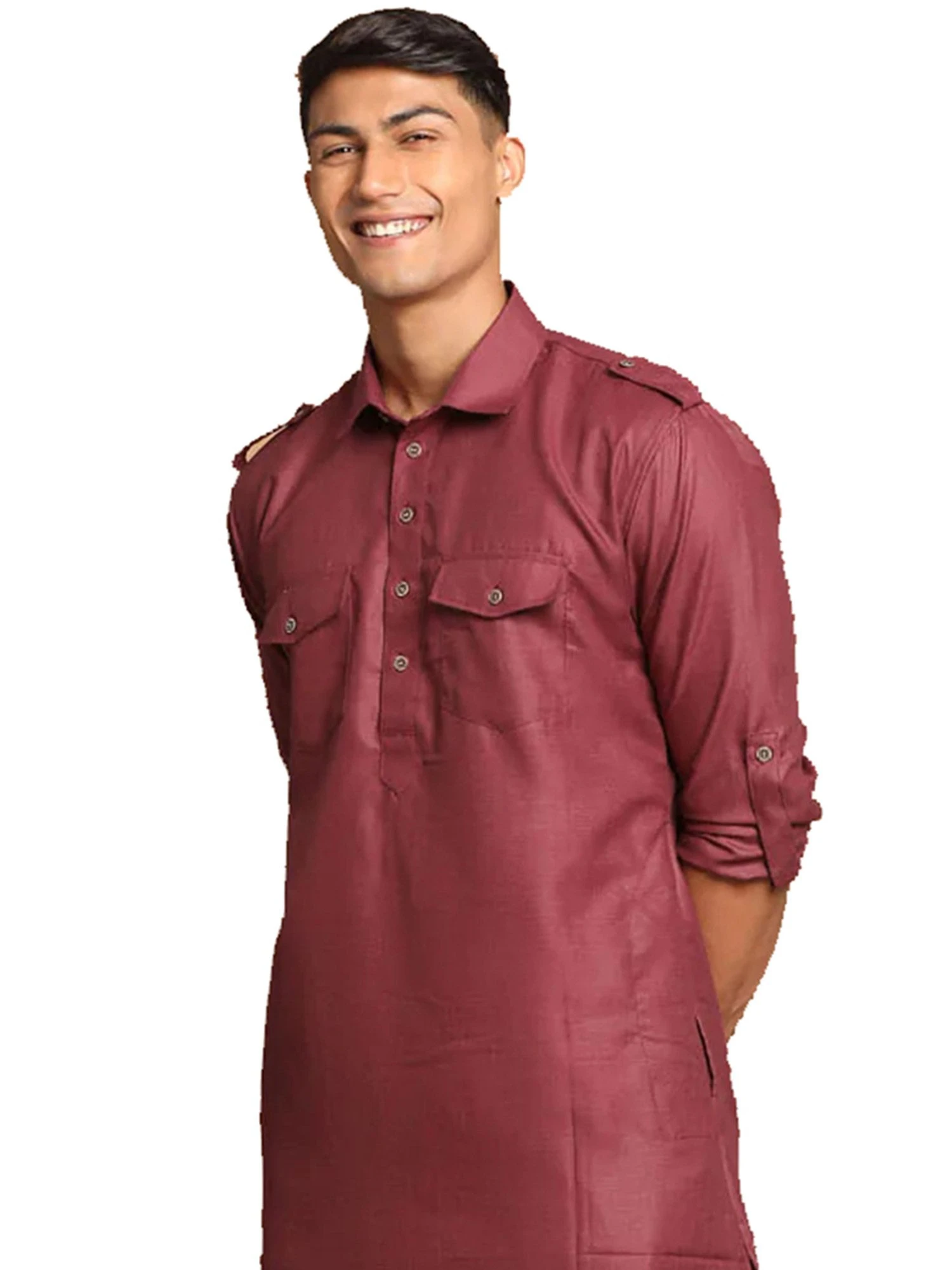 Look all grooved up adorning this rosewood pink color kurta made in cotton. Augmented with coller pattern and patch pockets. Paired with a white color pathani salwar in cotton. Note: Some color variations may occur owing to photography causes. Up to 1 inch of measurement fluctuation is possible.