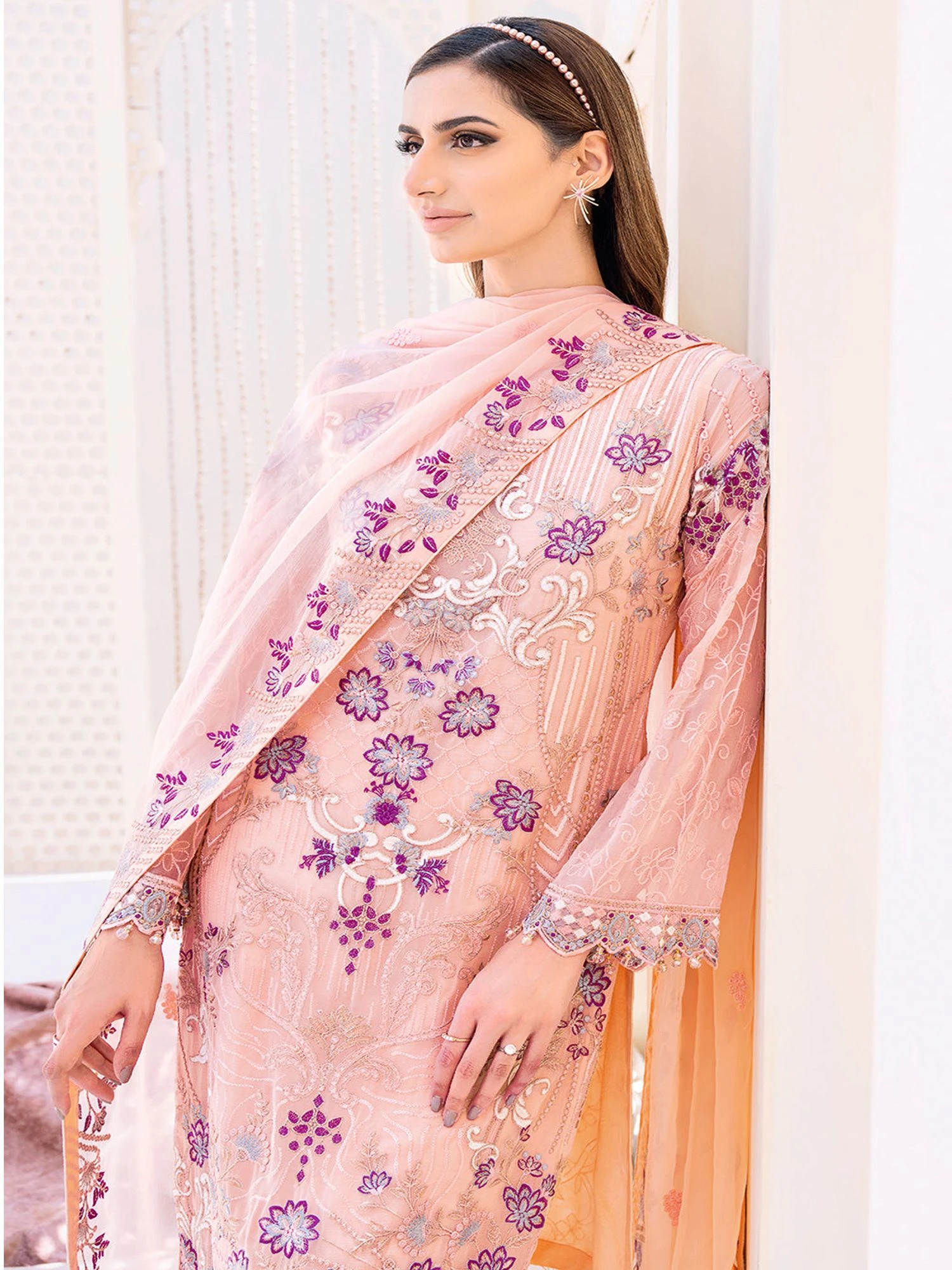 Enhance yourself with this pastel pink color straight cut kameez in georgette. Crafted using thread wok with floral embroidery all over. Teamed with a georgette dupatta and a pant style bottom, both made in pink color. Note: Accessories shown are for styling purpose only. Slight color variation may occur due to photographic reasons. The semi-stitched kameez can be customised upto 42 inches.