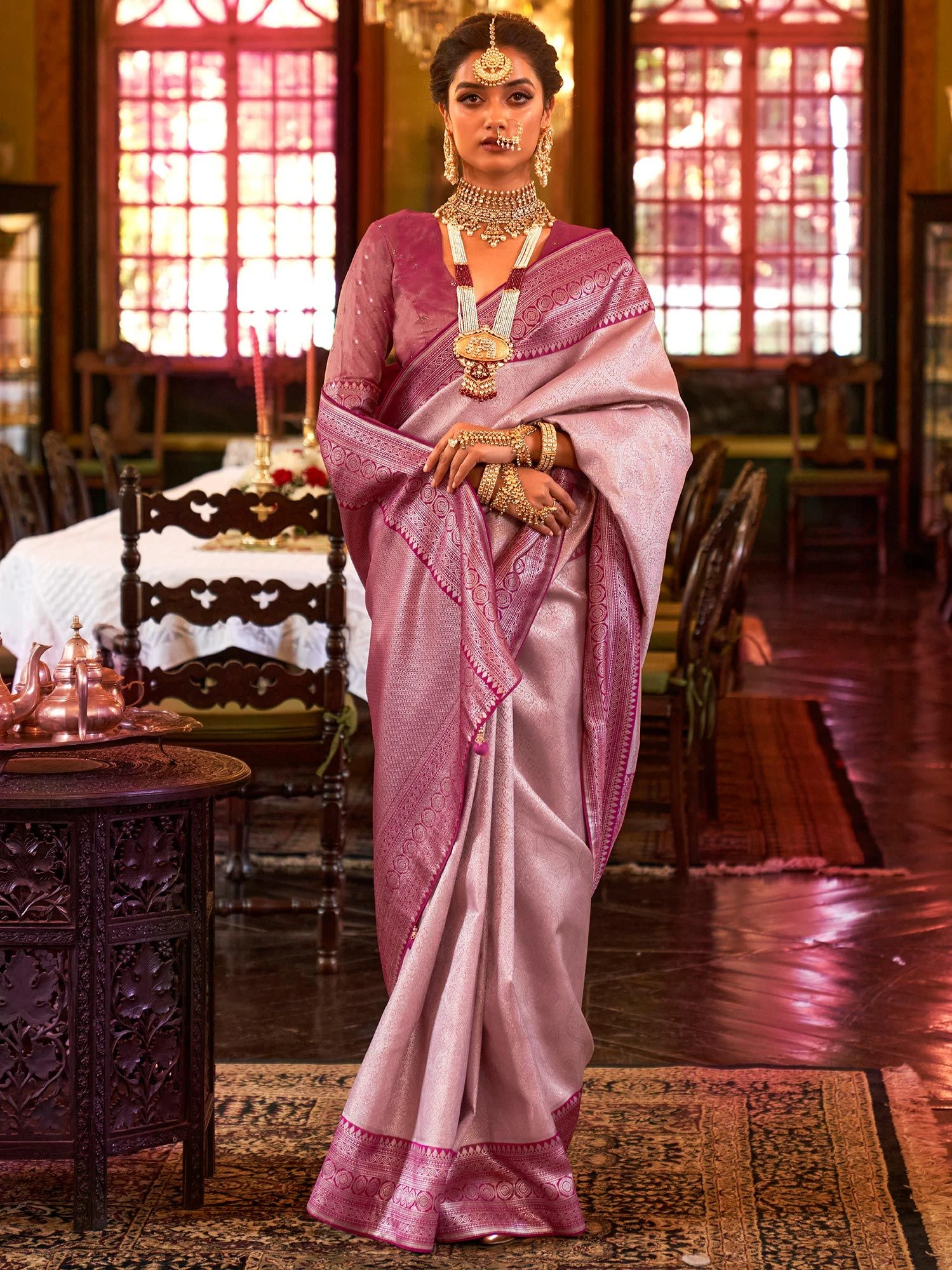 Wrap yourself in elegance adorning this light pink color saree crafted in silk. Furnished using zari woven patterns, showcasing distinstive borders and pallu. Available with a contrast matching deep pink color blouse in silk. Note: The accessories featured are purely for fashion purposes. Due to photography reasons, some color variations may occur. The un-stitched blouse may be customized up to 42 inches.