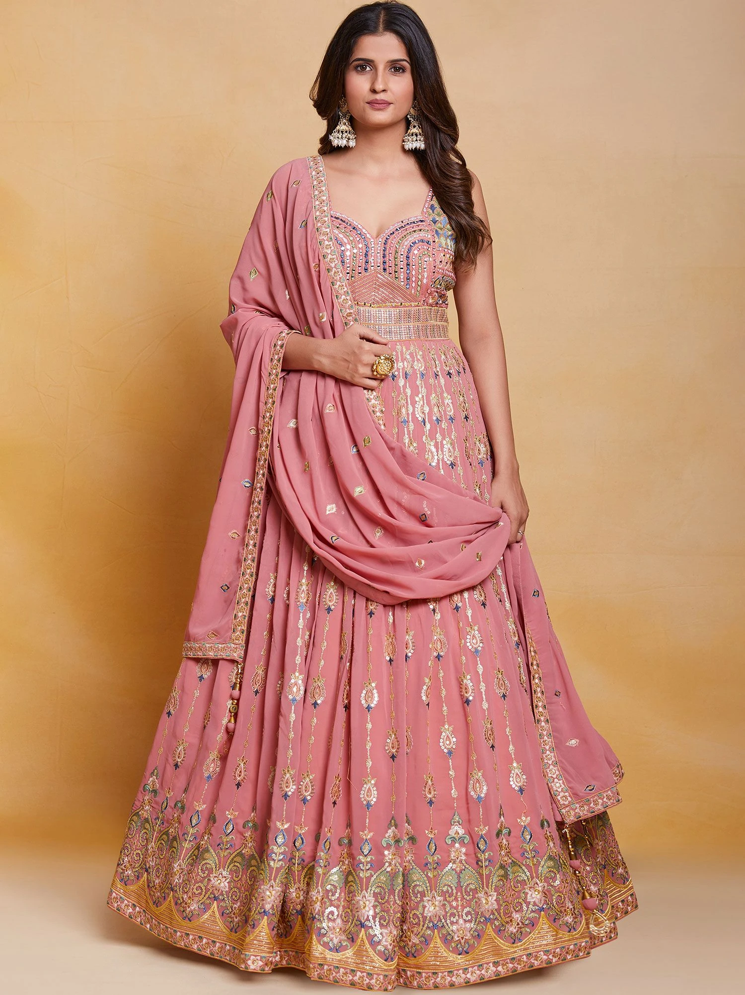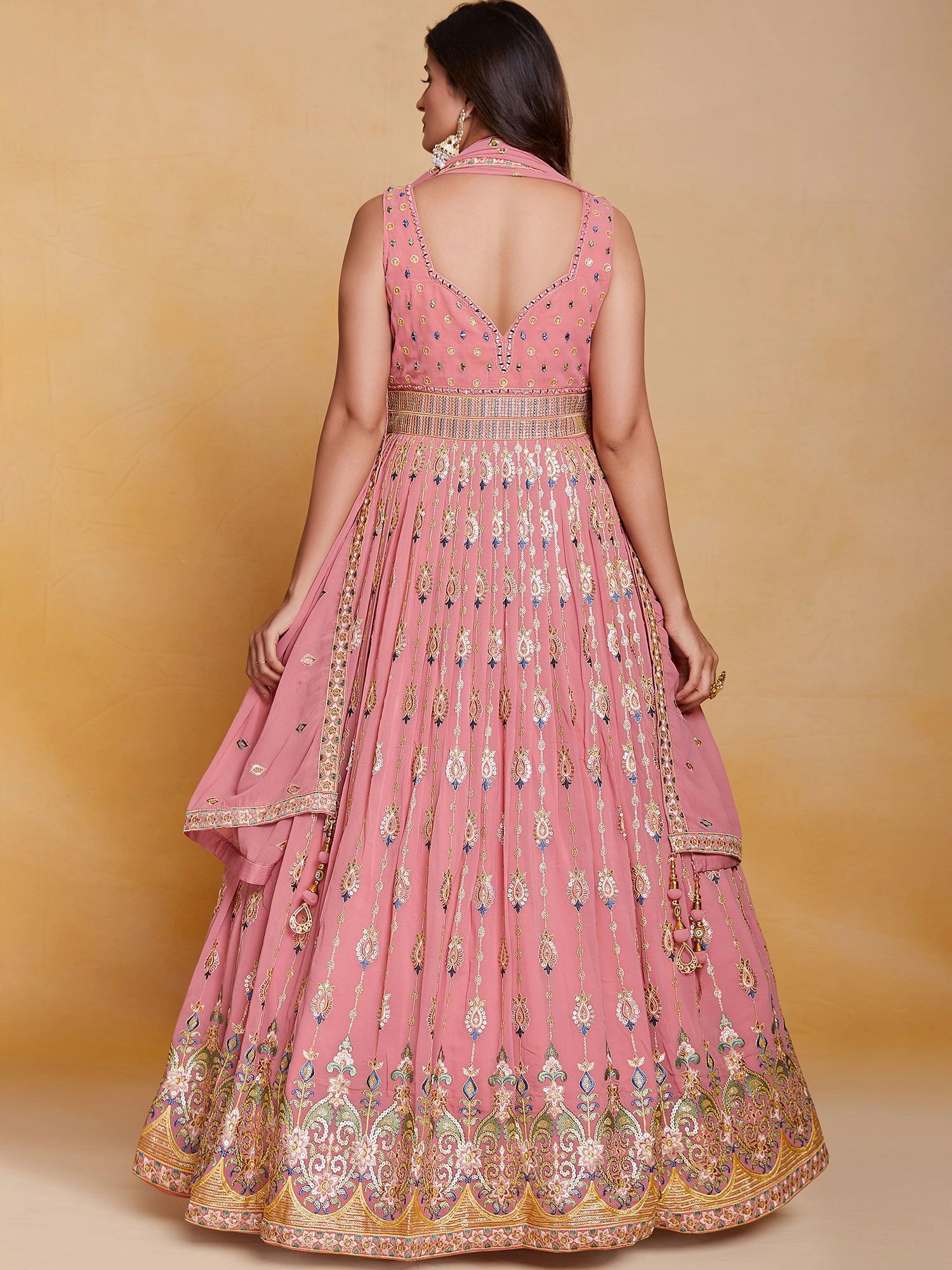 Mark your appearance adorning this soft pink hued anarkali kameez in georgette. Elevated using sequins, mirror work and thread work embroidery all over. Comes with a pink embroidered dupatta and matching bottom, both made in georgette. Note: Accessories shown are for styling purpose only. Slight color variation may occur due to photographic reasons. The semi-stitched kameez can be customised upto 42 inches.