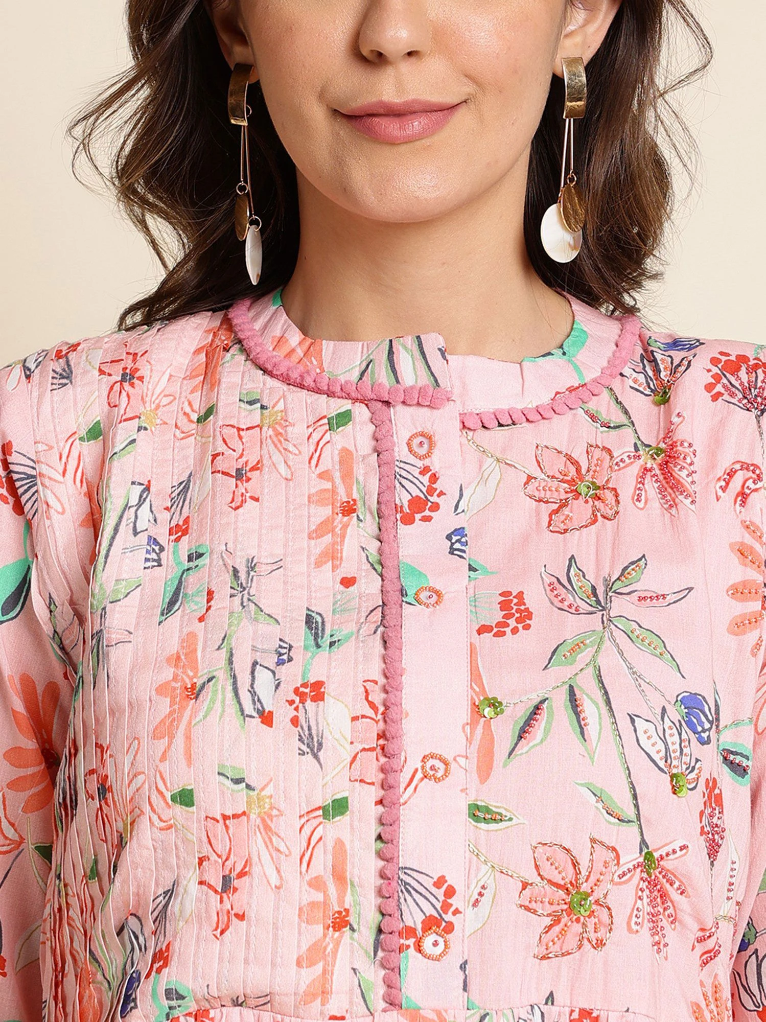 Exude summer grace adorning this baby pink color kurta made in cotton. Enhanced with dense floral prints all over and crafted with bell sleeves. Note: Some color variations may occur owing to photography causes. Up to 1 inch of measurement fluctuation is possible.