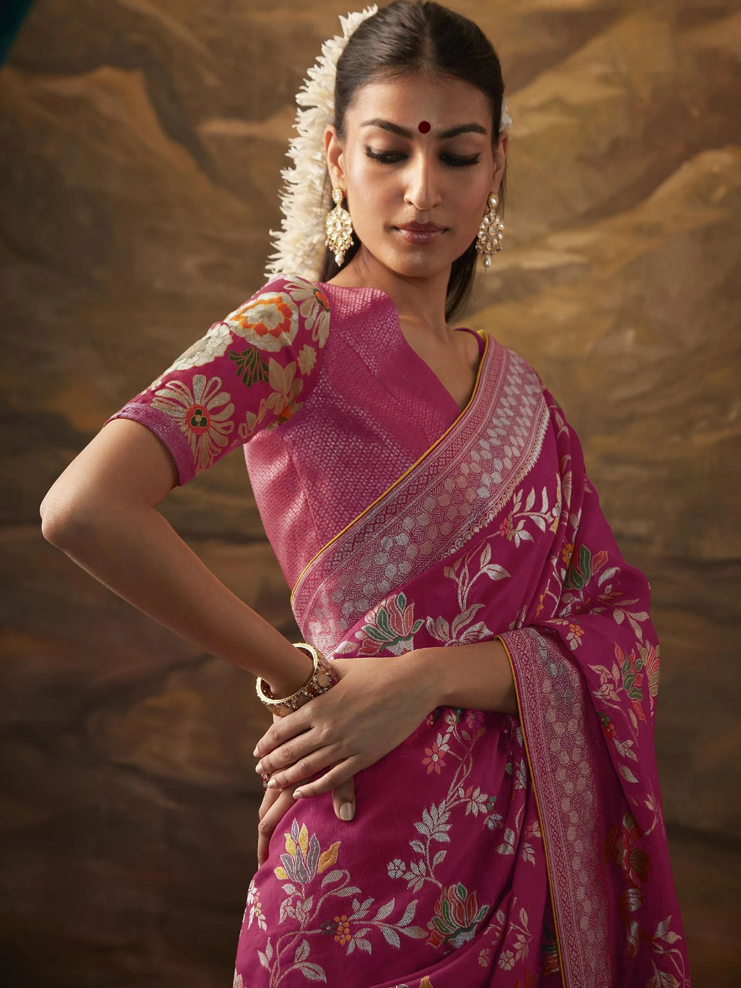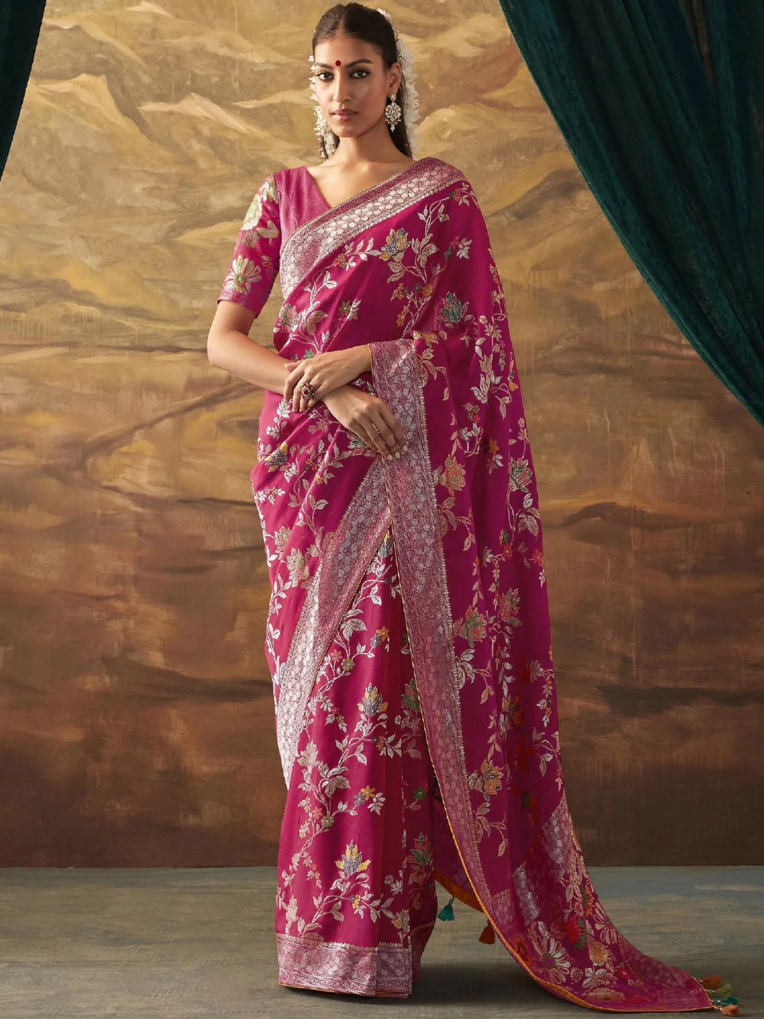 Wrap yourself in culture wearing this magenta pink color saree crafted in dola silk. Enhanced using thread, zari woven and printed patterns, showcasing distinstive borders and pallu. Comes with a matching pink color blouse in dola silk. Note: The accessories featured are purely for fashion purposes. Due to photography reasons, some color variations may occur. The un-stitched blouse may be customized up to 42 inches.