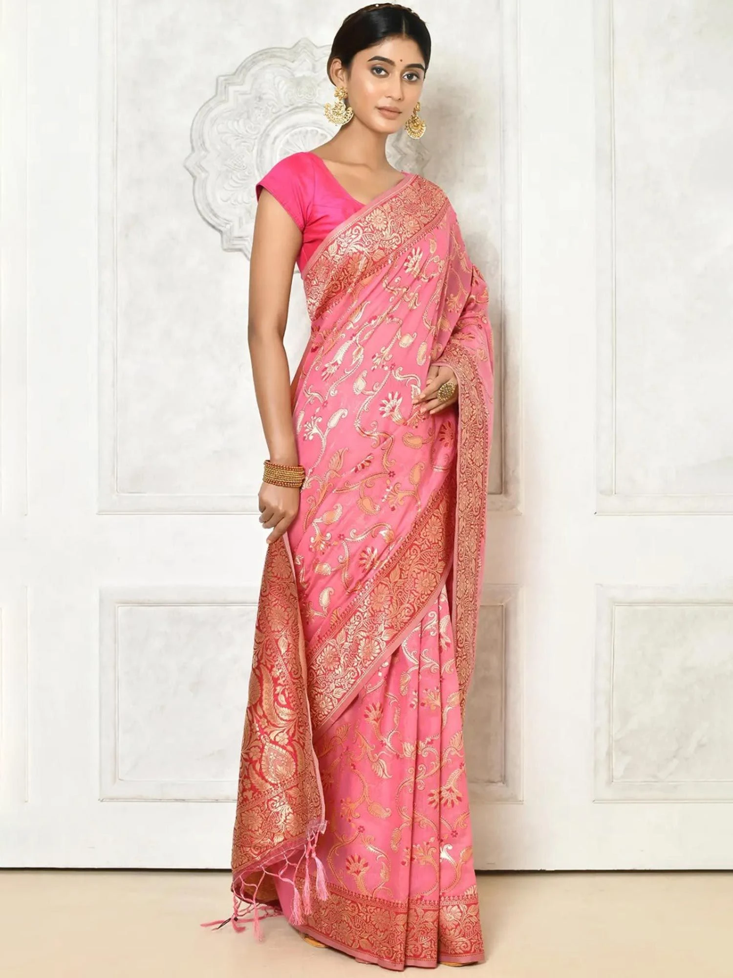 Grab all the attention as you wear this pink color saree crafted in cotton. Designed using zari woven floral patterns, showcasing distinstive borders and pallu. Comes with a matching pink color blouse in cotton. Note: The accessories featured are purely for fashion purposes. Due to photography reasons, some color variations may occur. The un-stitched blouse may be customized up to 42 inches.