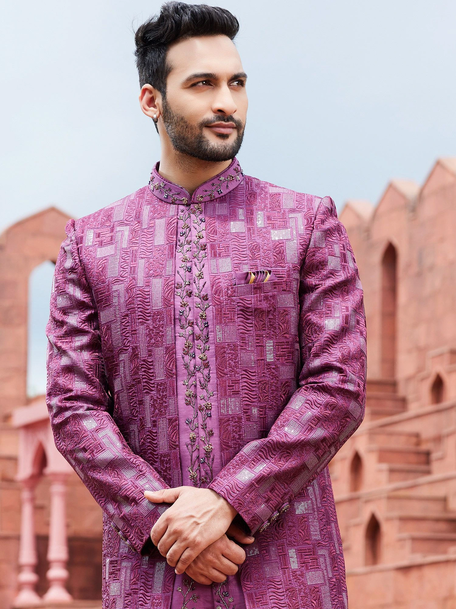 Shine brighter wearing this light adorning this mulberry pink color jacketed indowestern sherwani made in silk. Augmented using heavy thread embroidery work with stone work . Paired with off-white color churidaar in silk. Note: Some color variations may occur owing to photography causes. Up to 1 inch of measurement fluctuation is possible.