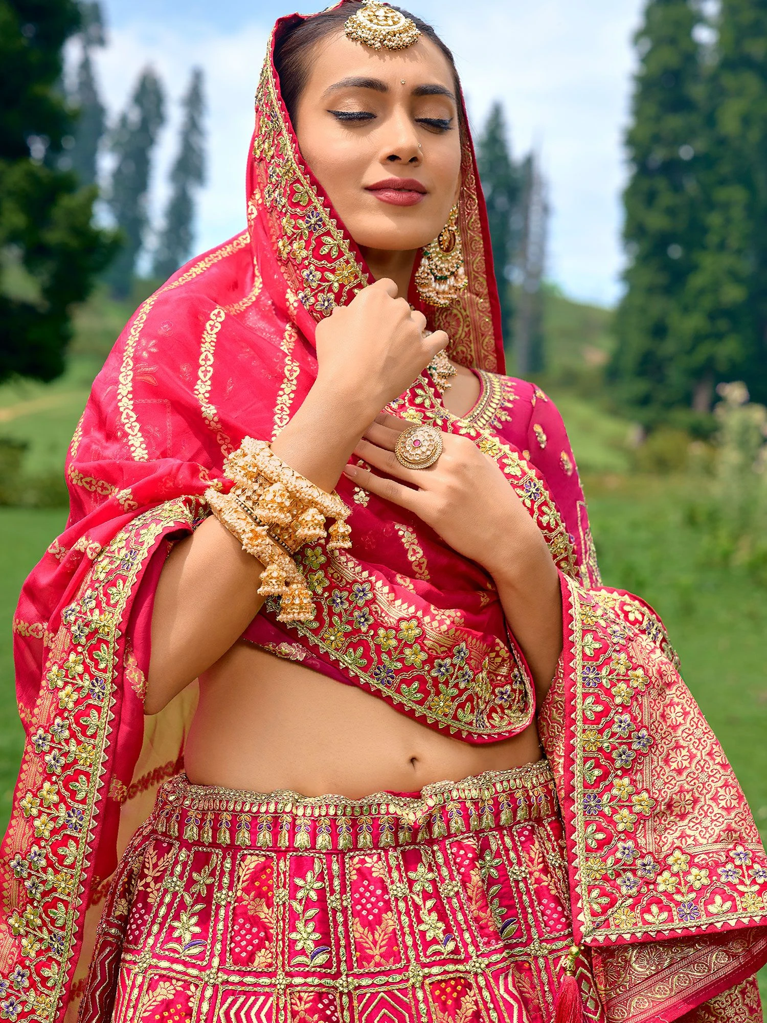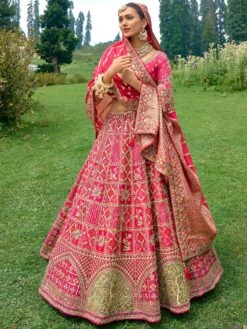 Exude major dreamy vibes with wearing this punch pink color designer lehenga in silk. Decorated with sequins, stones and zari with thread embroidered work. Paired with a matching pink color embroidered choli in pure silk and pink color dupatta, made in soft silk. Note: The accessories featured are purely for fashion purposes. Due to photography reasons, some color variations may occur. The semi-stitched choli and lehenga waist may be customized up to 42 inches.