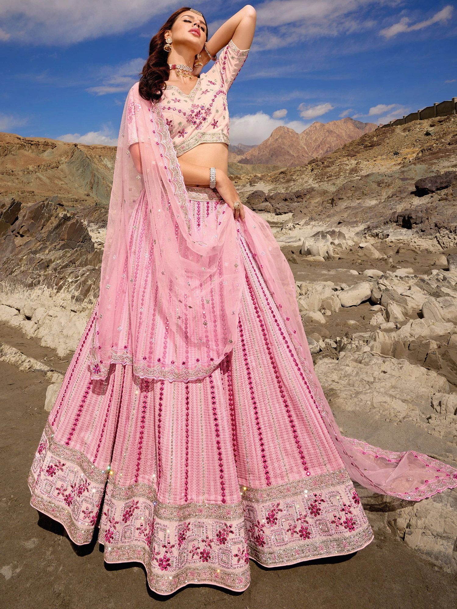 Be the best dressed diva wearing this baby pink color designer lehenga in georgette. Elevated with sequins, mirror and zari with thread embroidered work. Comes with a matching pink color embroidered choli in georgette and pink color dupatta, made in net. Note: The accessories featured are purely for fashion purposes. Due to photography reasons, some color variations may occur. The semi-stitched choli and lehenga waist may be customized up to 42 inches.