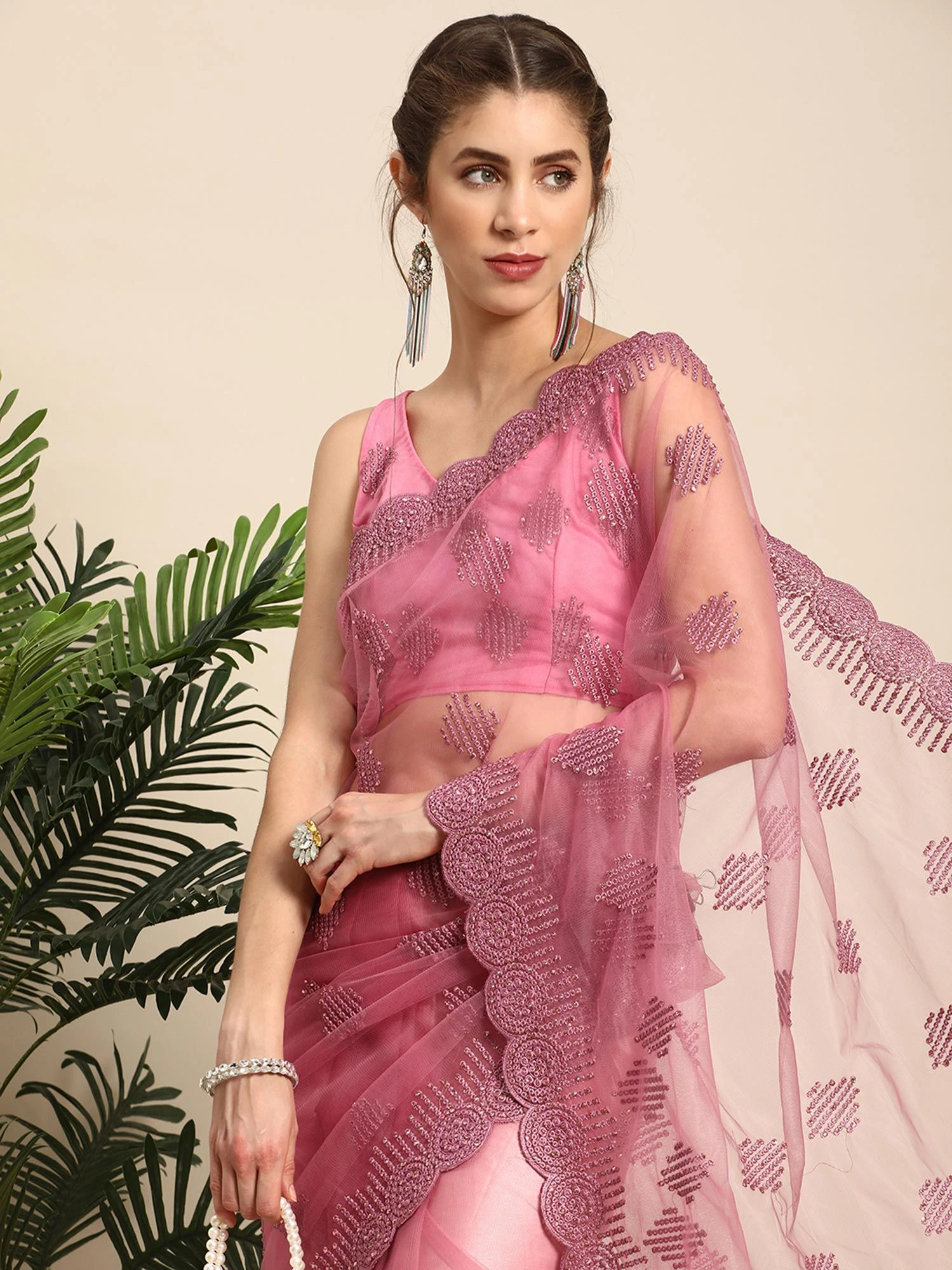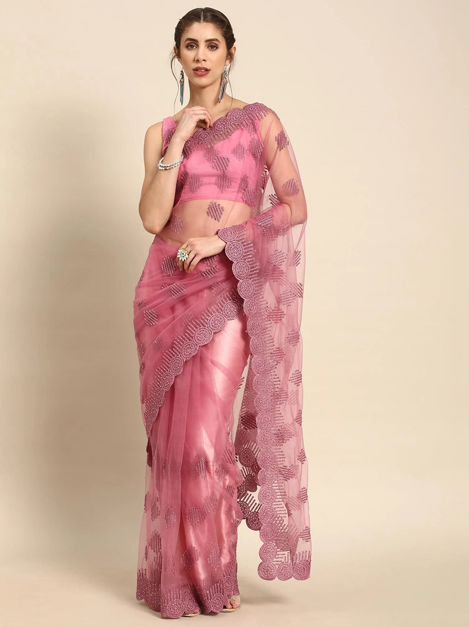 Illuminate your surroundings wearing this metallic pink color saree made in net. Decorated using thread embroidered patterns with stone embellishments, all over. Paired with a matching pink color blouse in net. Note: The accessories featured are purely for fashion purposes. Due to photography reasons, some color variations may occur. The un-stitched blouse may be customized up to 42 inches.