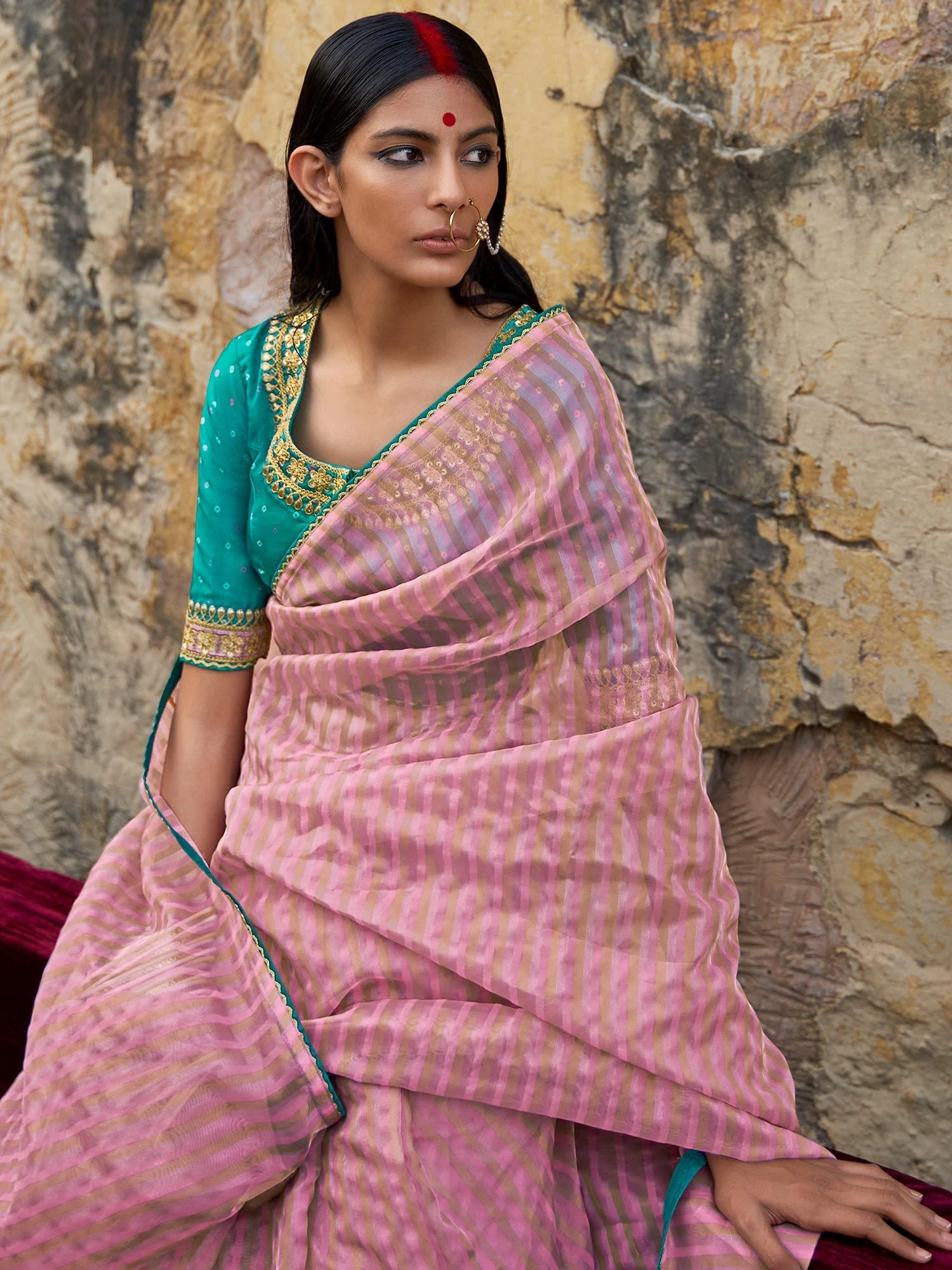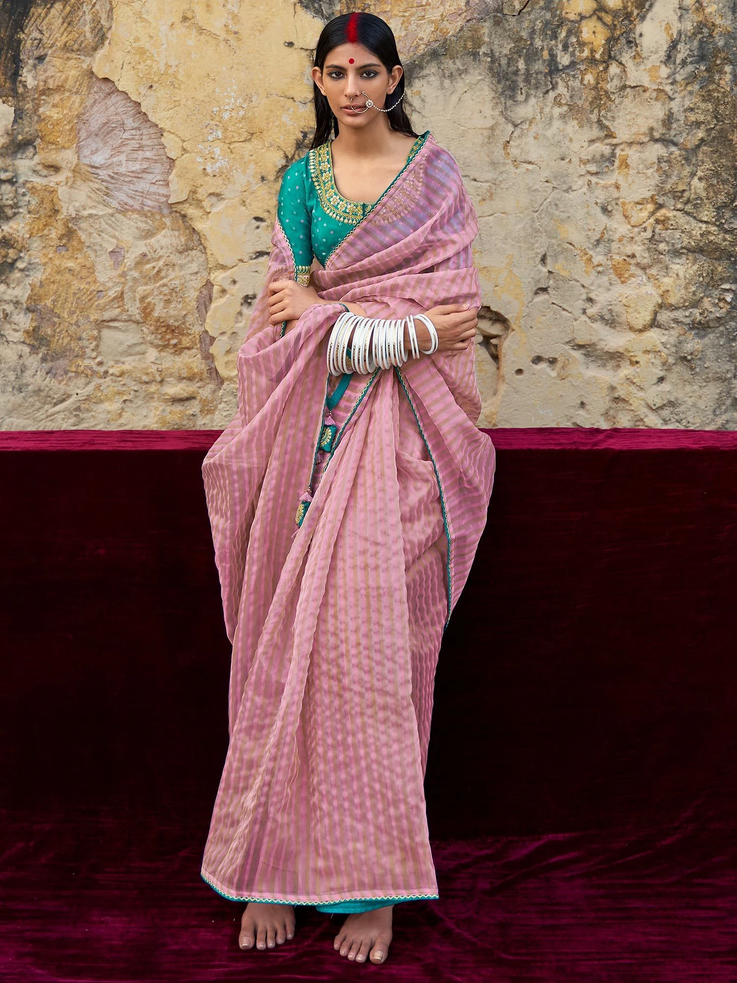 Evoke the indian diva in you wearing this soft pink color saree crafted in organza. Decortaed using printed patterns with enhanced borders using lace. Comes with a contrast matching turquoise color silk blouse designed with embroidery. Note: The accessories featured are purely for fashion purposes. Due to photography reasons, some color variations may occur. The un-stitched blouse may be customized up to 42 inches.