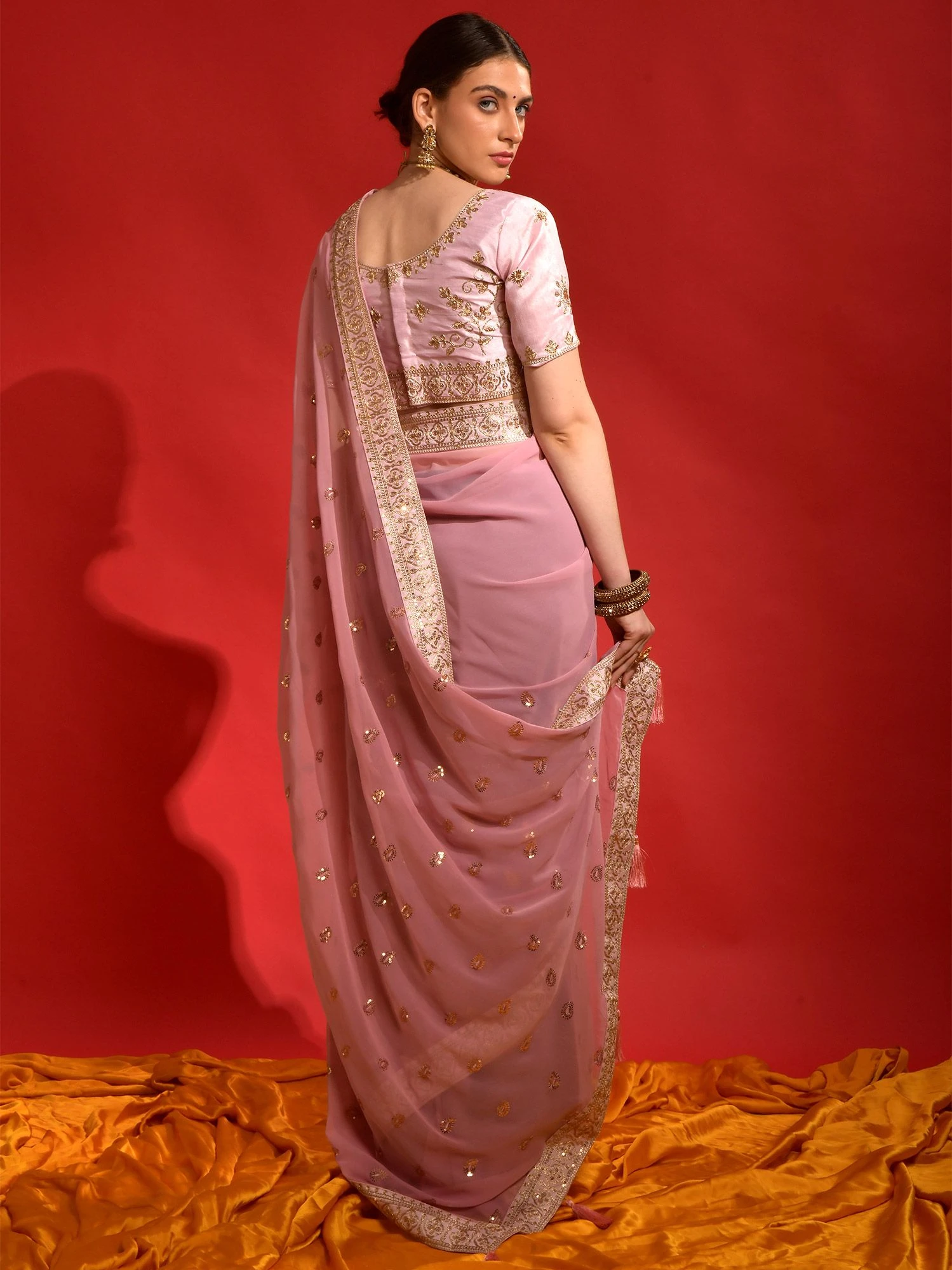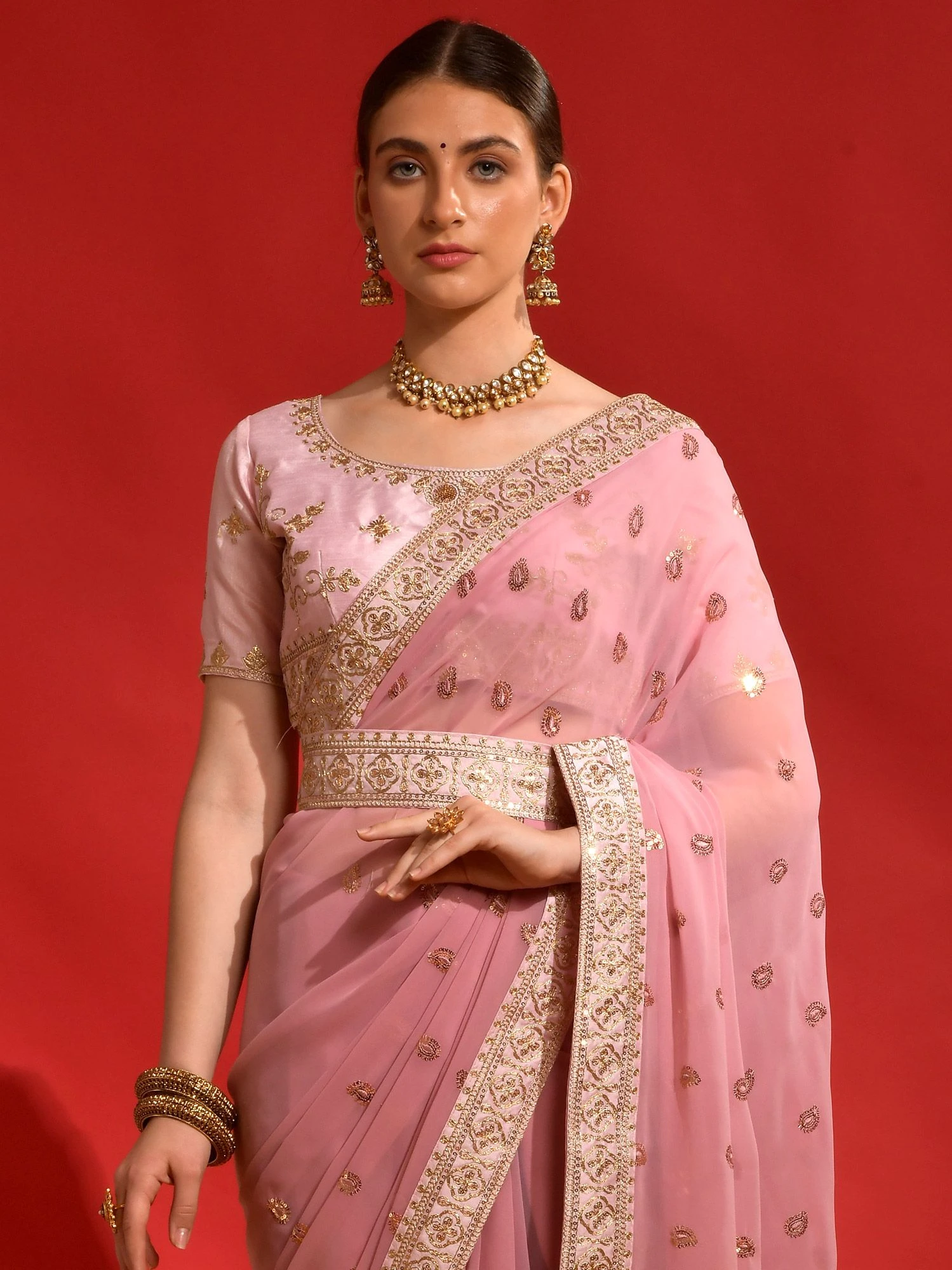 Slay with your ethnic style wearing this bbay pink color saree in georgette. Crafted using zari and sequins embroidered patterns, showcasing distinstive borders. Available with a matching pink color embroidered blouse in georgette. Note: The accessories featured are purely for fashion purposes. Due to photography reasons, some color variations may occur. The un-stitched blouse may be customized up to 42 inches.