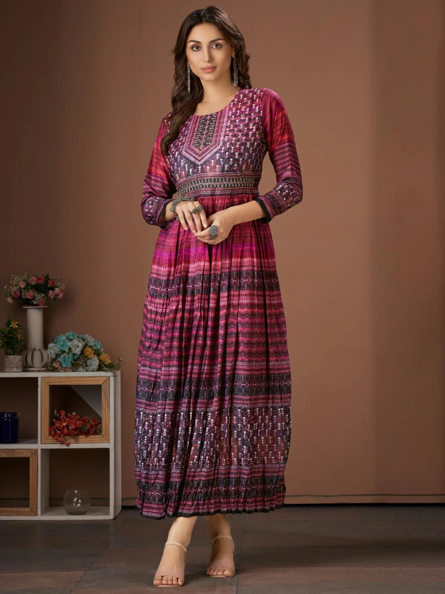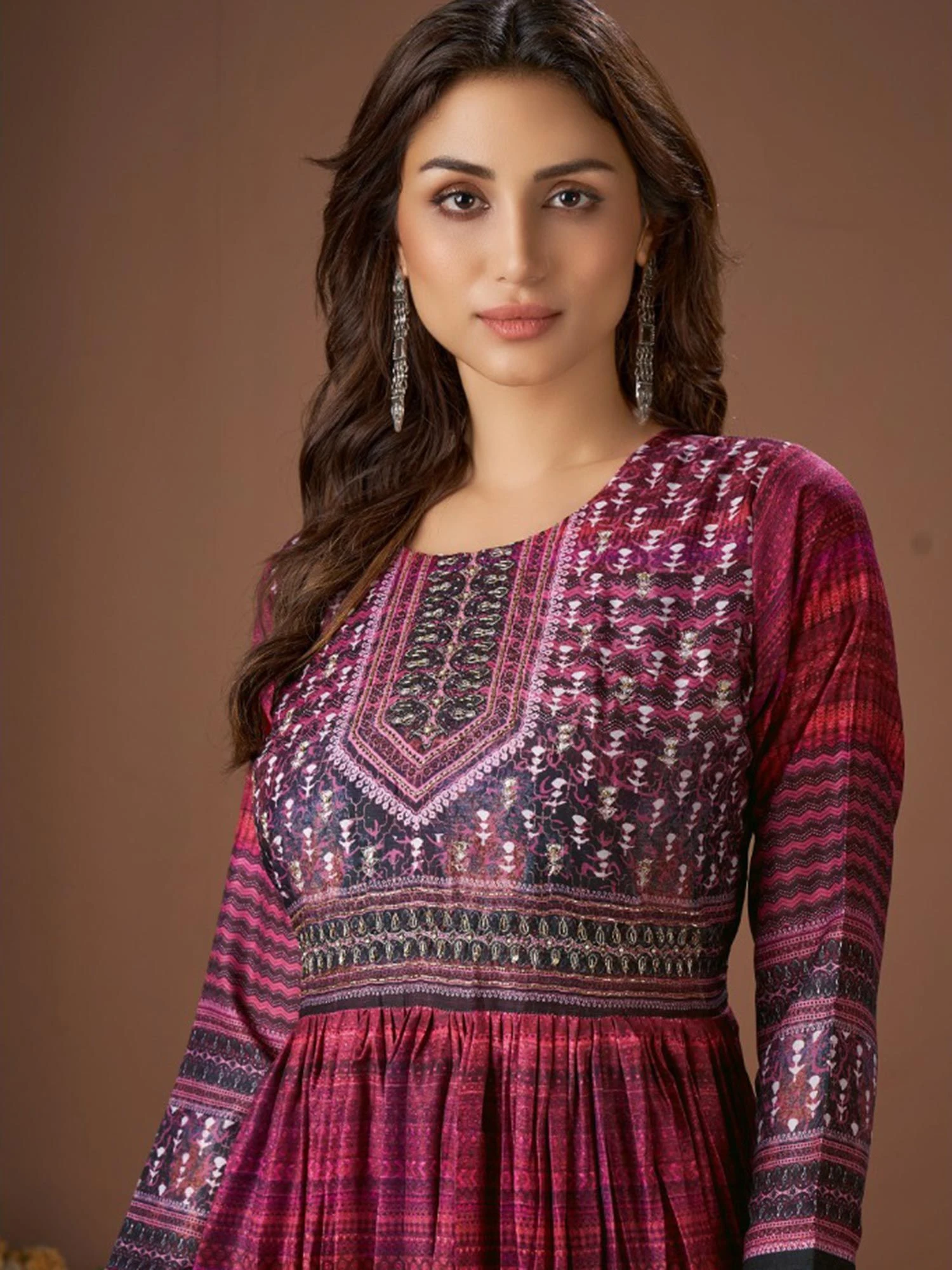 Get all the compliments wearing this lush pink color quarter sleeved kurta made in cotton. Furnished with printed details all over with embroidered work along the edges. Note: Some color variations may occur owing to photography causes. Up to 1 inch of measurement fluctuation is possible.
