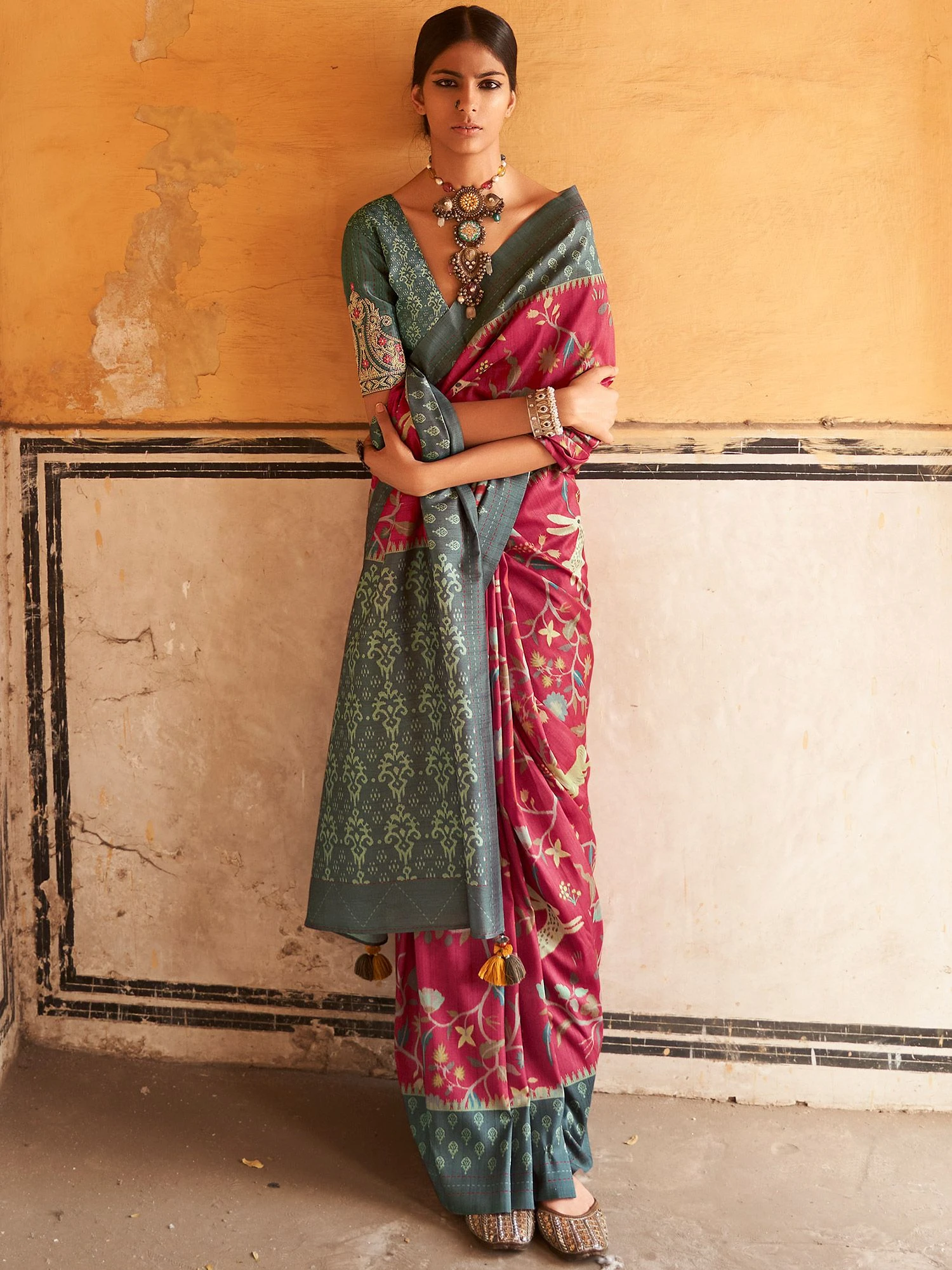 Make a lasting impression wearing this punch pink color saree made in tussar silk. Furnished using printed patterns, showcasing distinstive borders and pallu. Teamed with a matching slate blue color embroidered blouse in tussar silk. Note: The accessories featured are purely for fashion purposes. Due to photography reasons, some color variations may occur. The un-stitched blouse may be customized up to 42 inches.
