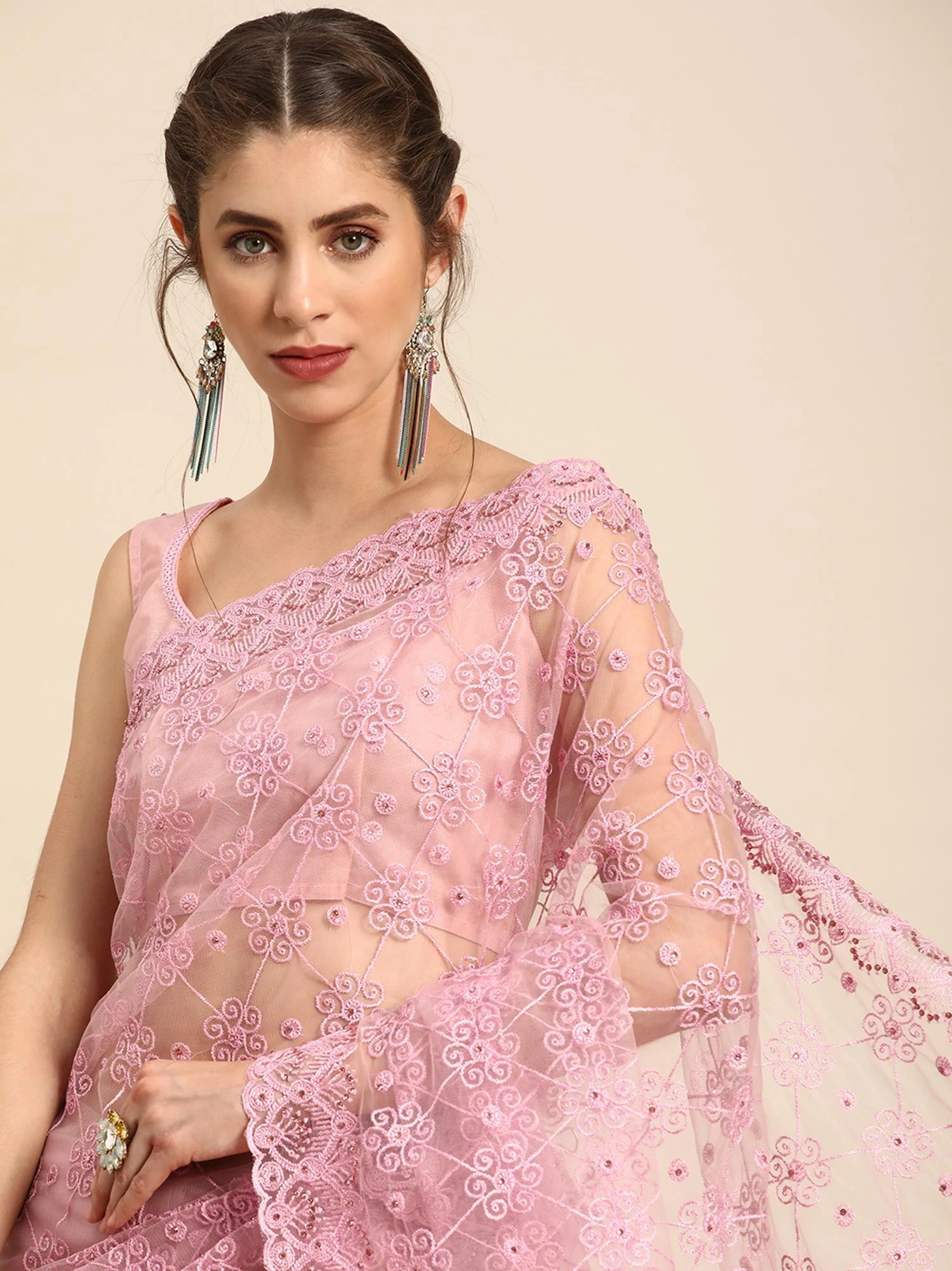 Slay with your unique styling game with this rose pink color saree made in net. Designed using thread embroidered patterns with stone embellishments, all over. Comes with a matching pink color blouse in net. Note: The accessories featured are purely for fashion purposes. Due to photography reasons, some color variations may occur. The un-stitched blouse may be customized up to 42 inches.