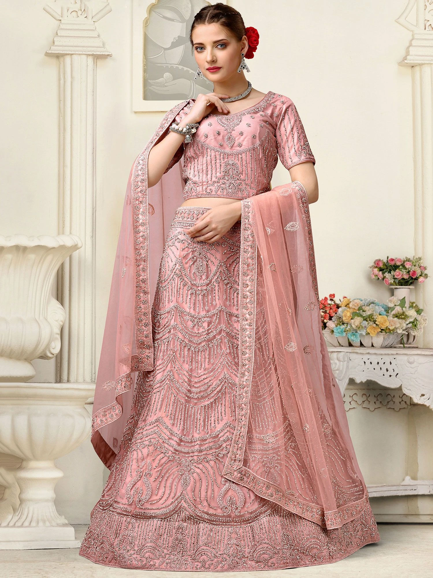 Shine bright all day wearing this soft pink color lehenga in net. Decorated with stones and thread embroidered work. Comes with a matching pink color embroidered choli in net and a pink net dupatta with embroidered borders. Note: The accessories featured are purely for fashion purposes. Due to photography reasons, some color variations may occur. The semi-stitched choli and lehenga waist may be customized up to 42 inches.