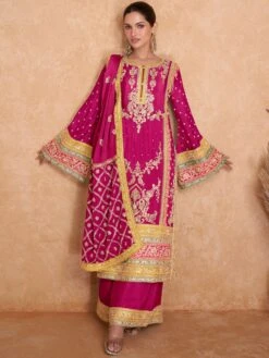 Cherish your look with this hot pink color straight cut kameez in crepe. Designed using sequins, zari and mirror work embroidery all over. Paired with a crepe dupatta and a palazzo style bottom, both made in hot pink. Note: Accessories shown are for styling purpose only. Slight color variation may occur due to photographic reasons. The semi-stitched kameez can be customised upto 42 inches.
