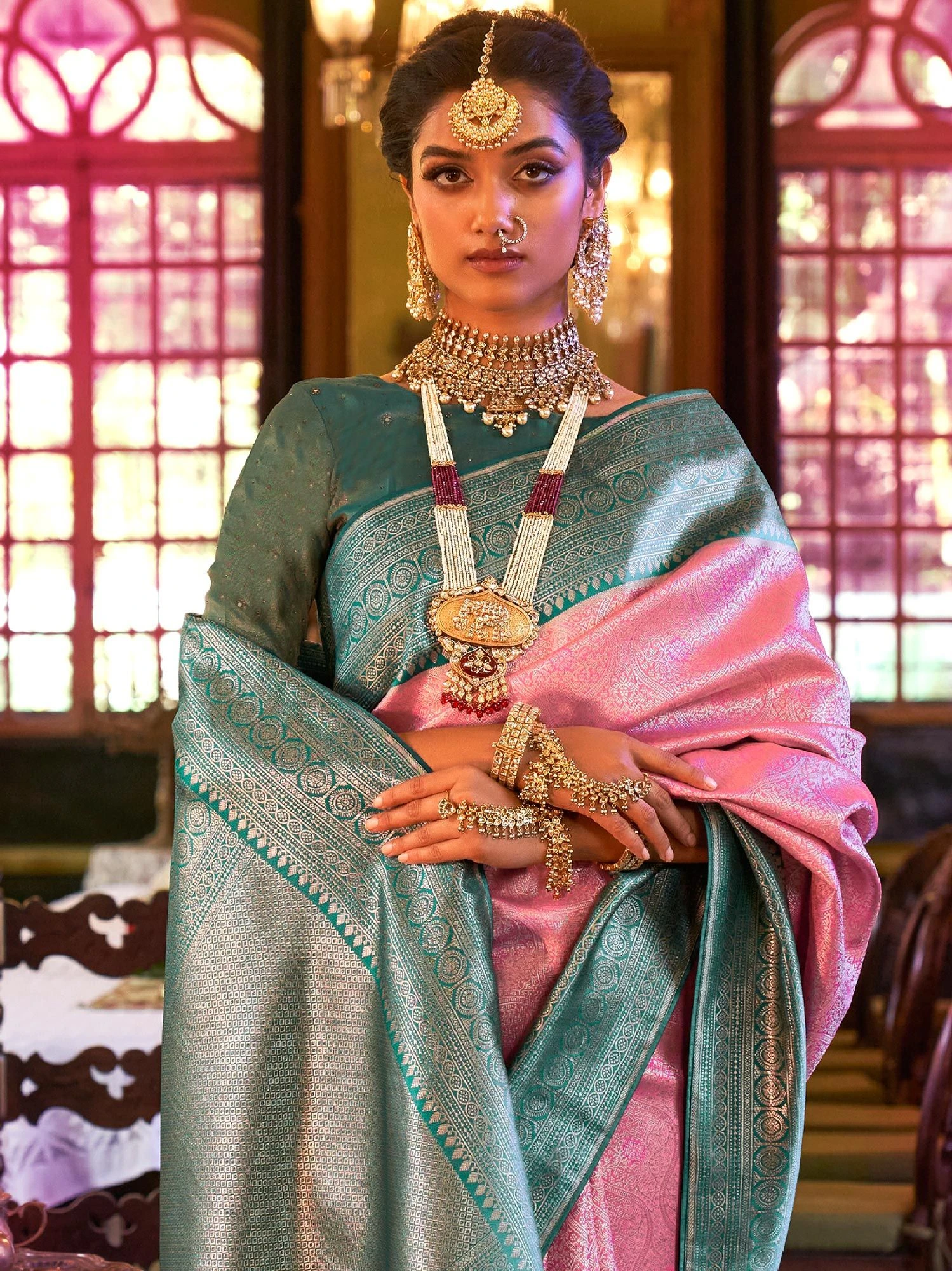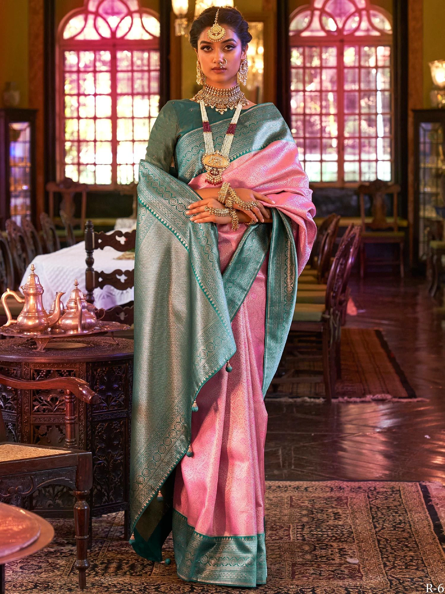 Step into the spotlight as you wear this pink color saree crafted in silk. Augmented using zari woven patterns, showcasing distinstive borders and pallu. Paired with a contrast matching blue color blouse in silk. Note: The accessories featured are purely for fashion purposes. Due to photography reasons, some color variations may occur. The un-stitched blouse may be customized up to 42 inches.