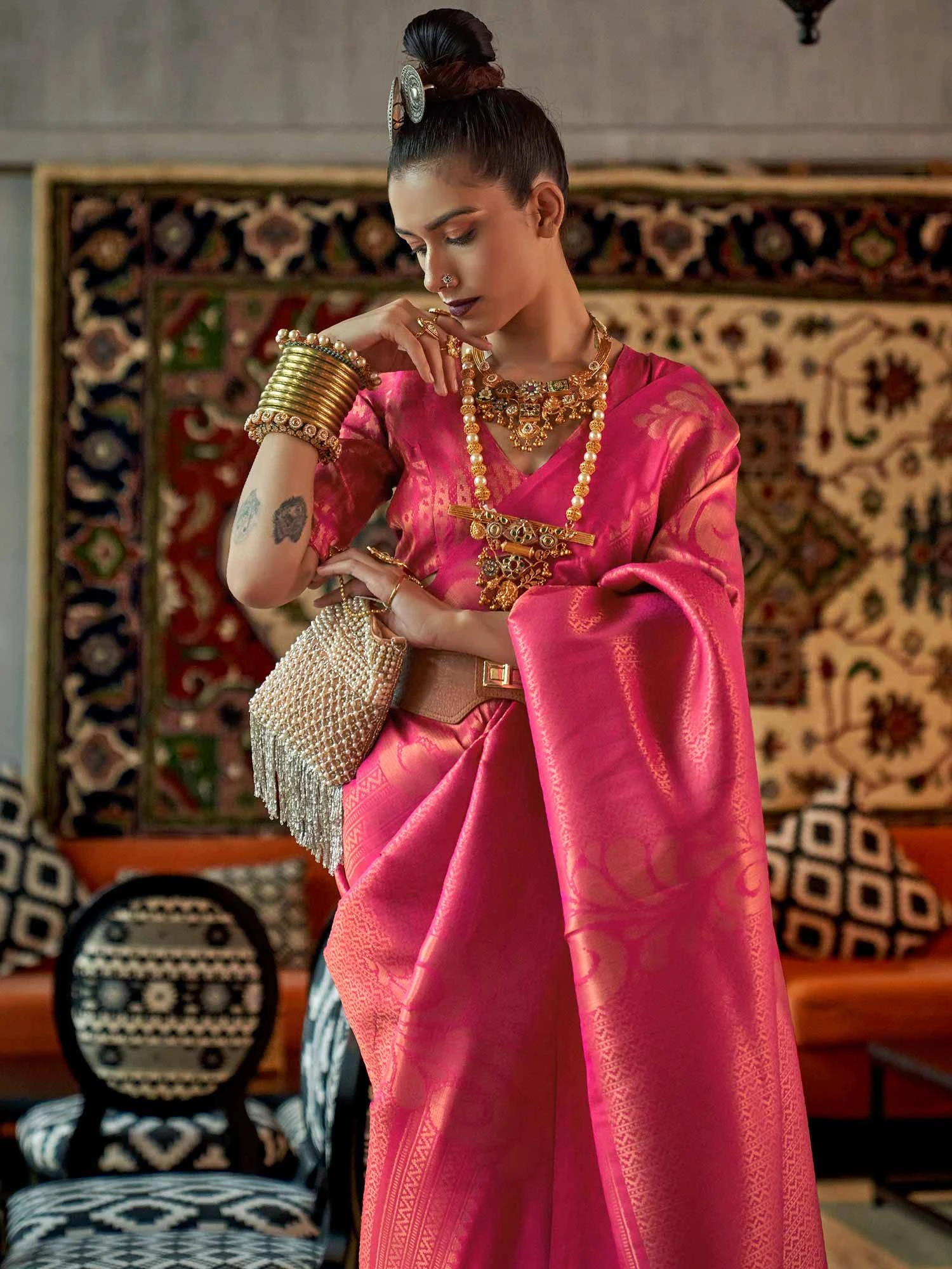 Enhance your ethnic wardrobe adorning this hot pink color saree crafted in silk. Enhanced using zari woven patterns, showcasing distinstive tasseled pallu. Assembled with a matching pink color blouse in silk. Note: The accessories featured are purely for fashion purposes. Due to photography reasons, some color variations may occur. The un-stitched blouse may be customized up to 42 inches.