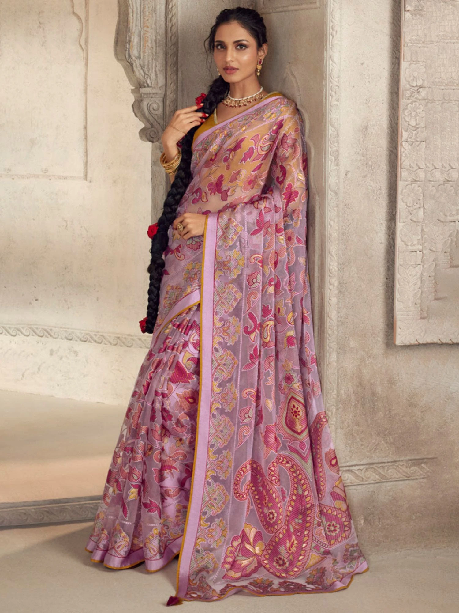 Casting a magical aura with every move wearing this dusty pink color saree fabricated in brasso. Decorated using woven patterns, displaying unique borders and pallu. Available with a matching yellow color blouse in brasso. Note: The accessories featured are purely for fashion purposes. Due to photography reasons, some color variations may occur. The un-stitched blouse may be customized up to 42 inches.