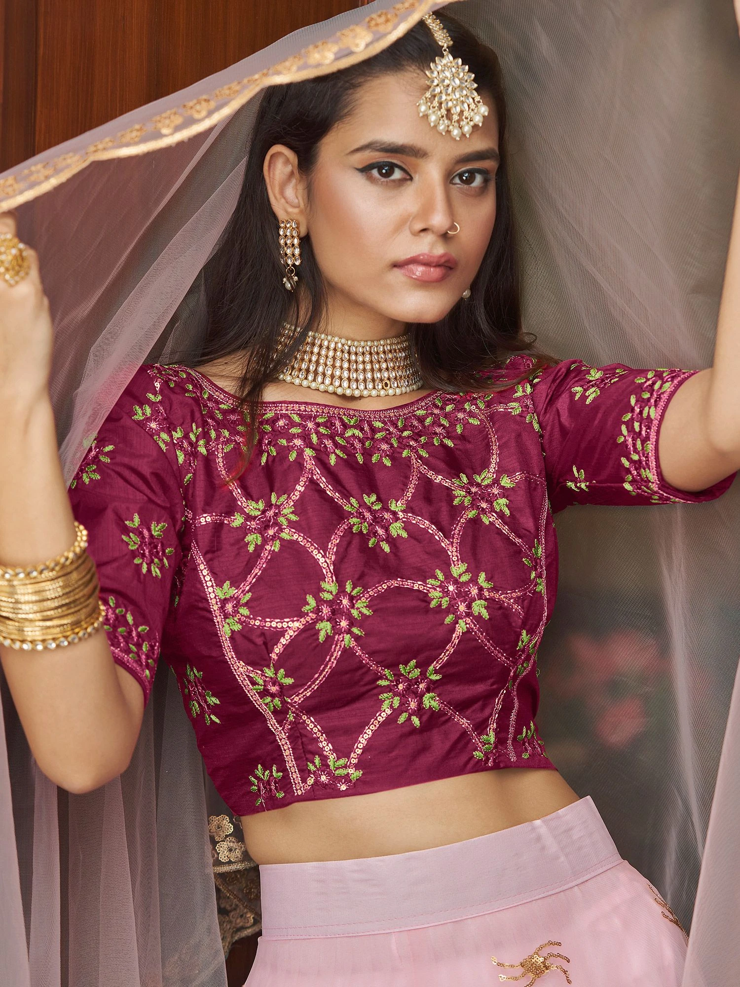Spread your charm everywhere wearing this baby pink color designer lehenga in net. Decorated with sequins and zari embroidered work. Paired with a matching barbie pink color thread embroidered choli in satin and pink color dupatta, made in net. Note: The accessories featured are purely for fashion purposes. Due to photography reasons, some color variations may occur. The semi-stitched choli and lehenga waist may be customized up to 42 inches.
