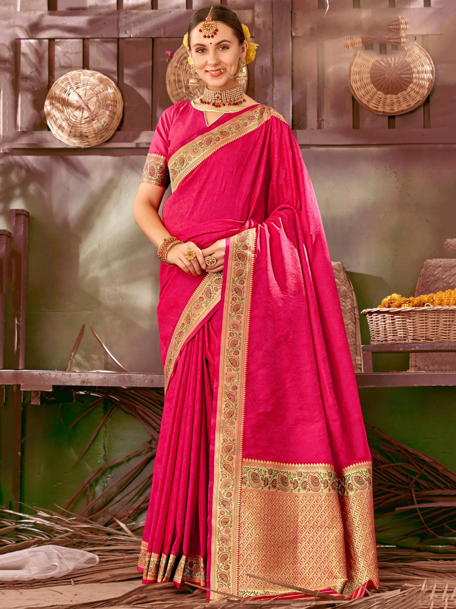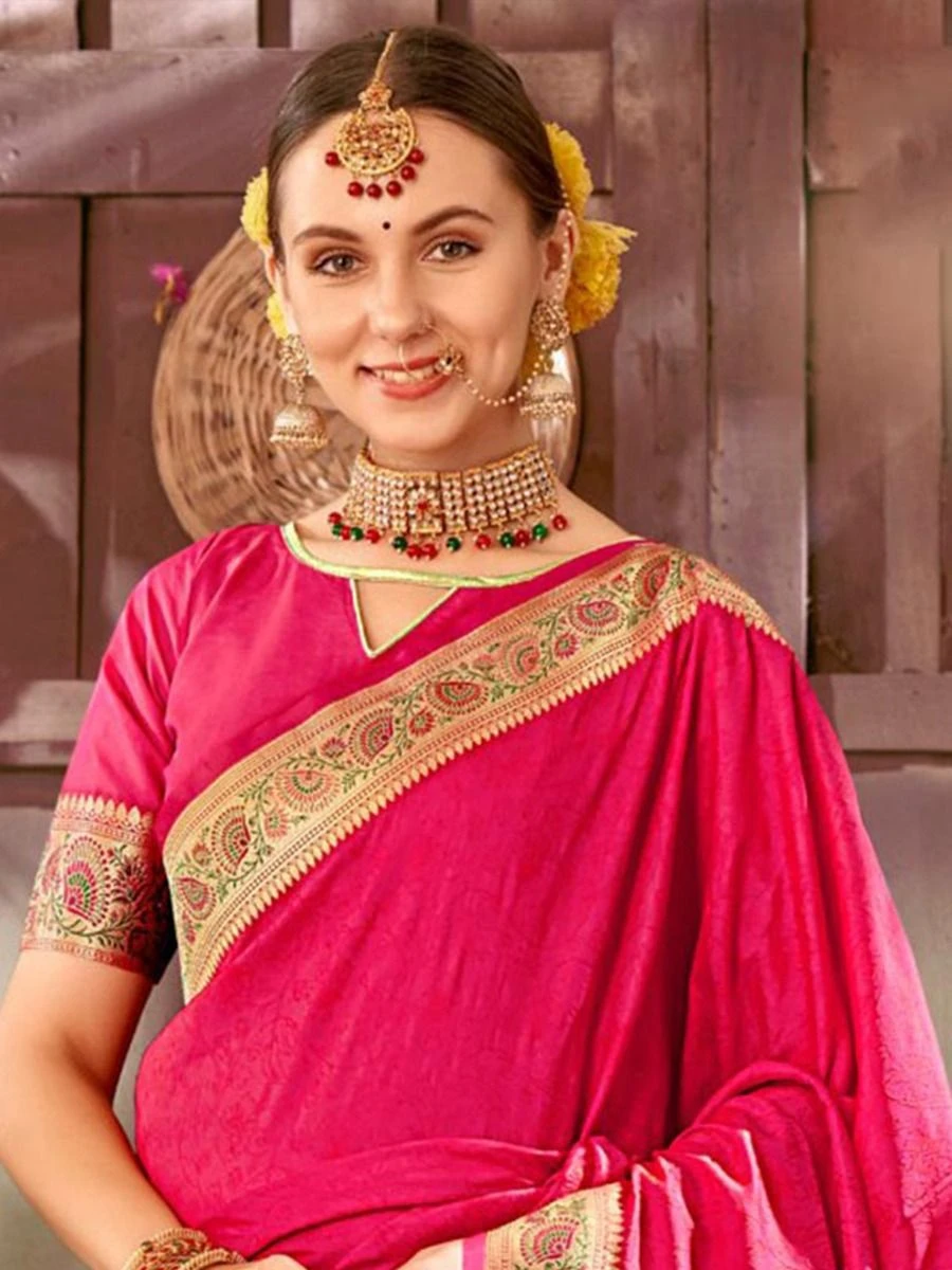 Steal the thunder wearing this hot pink color saree crafted in silk. Decorated using zari woven patterns, showcasing distinstive borders and pallu. Available with a matching pink color blouse in silk. Note: The accessories featured are purely for fashion purposes. Due to photography reasons, some color variations may occur. The un-stitched blouse may be customized up to 42 inches.