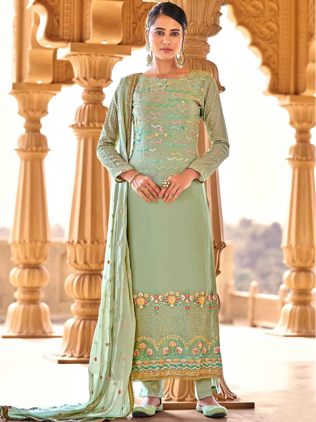 An fantastic Pista Green Colour Georgette Fabric Unstitched Salwar Kameez will make you look highly stylish and graceful. The lovely Zari,Thread,Sequin work a substantial attribute of this attire.