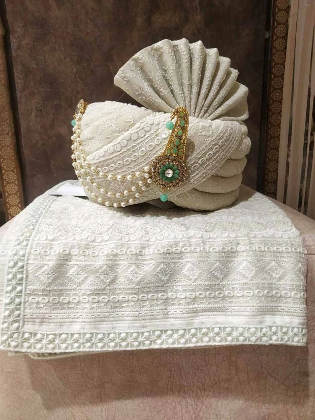 Pista Green Colour Lucknowi,Silk Fabric Groom Turban.
